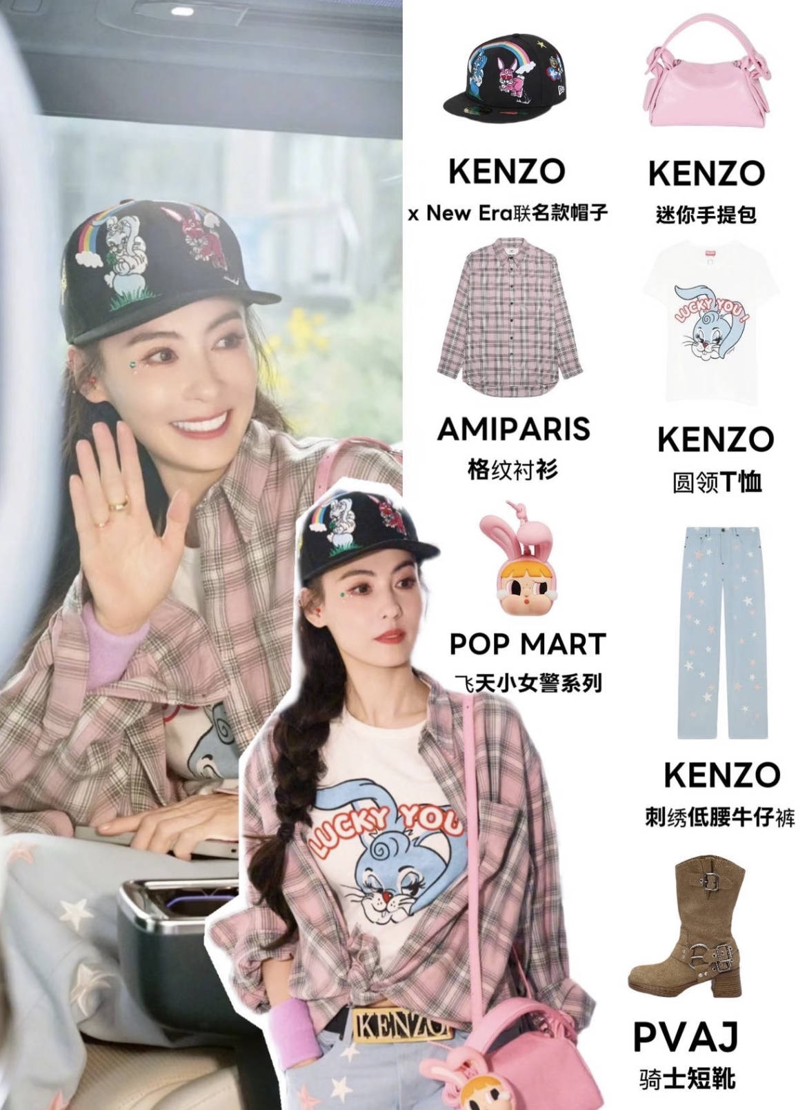录制节目主题穿的粉色格纹衬衫,搭配粉色KENZO手拎包与浅蓝刺绣牛仔裤做甜妹配色,泡泡玛特挂件戳中少女心,格纹衬衫敞开穿弱化正式感。