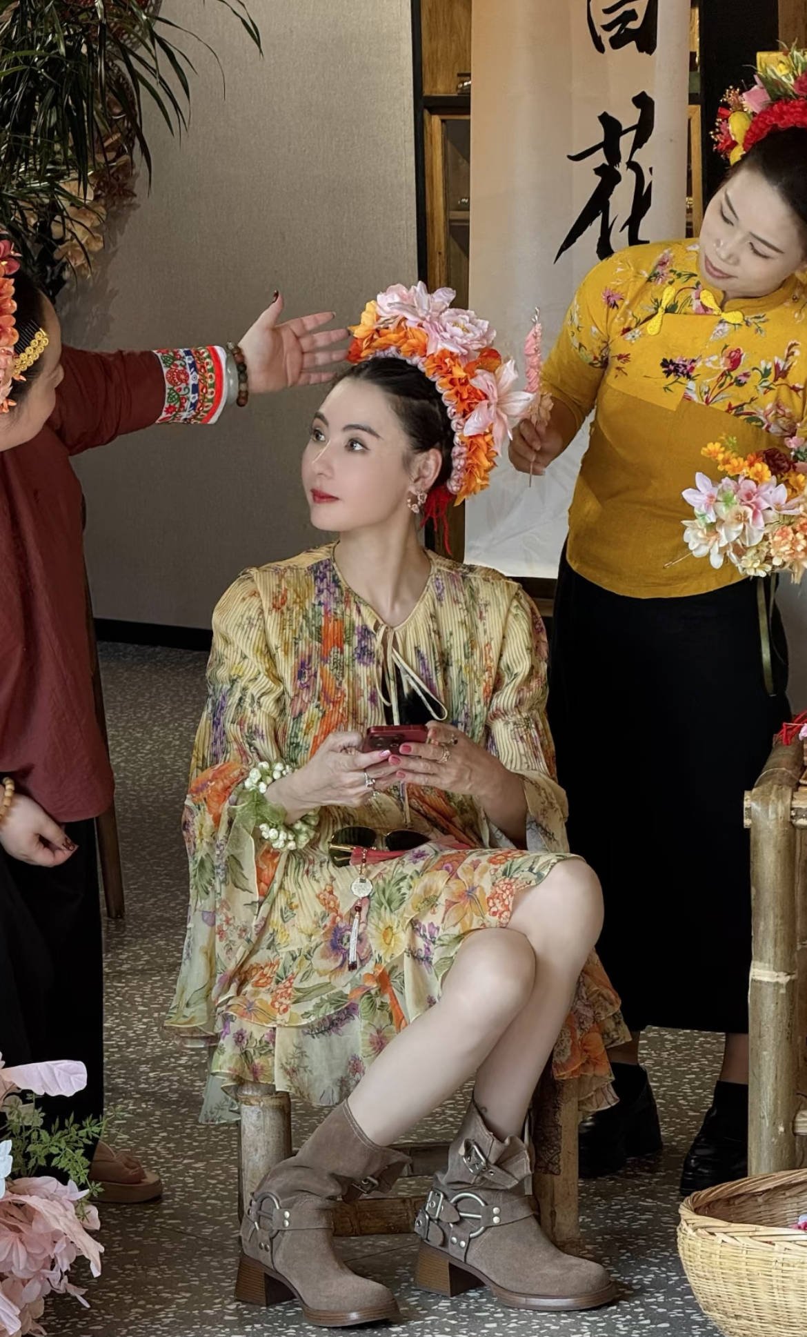 做簪花造型又是全然不同的浪漫风格,混搭Celine的印花裙,传统民俗与现代时尚碰撞出独特韵味,温柔又有风情。搭配PVAJ的游牧风长靴,甜酷平衡。