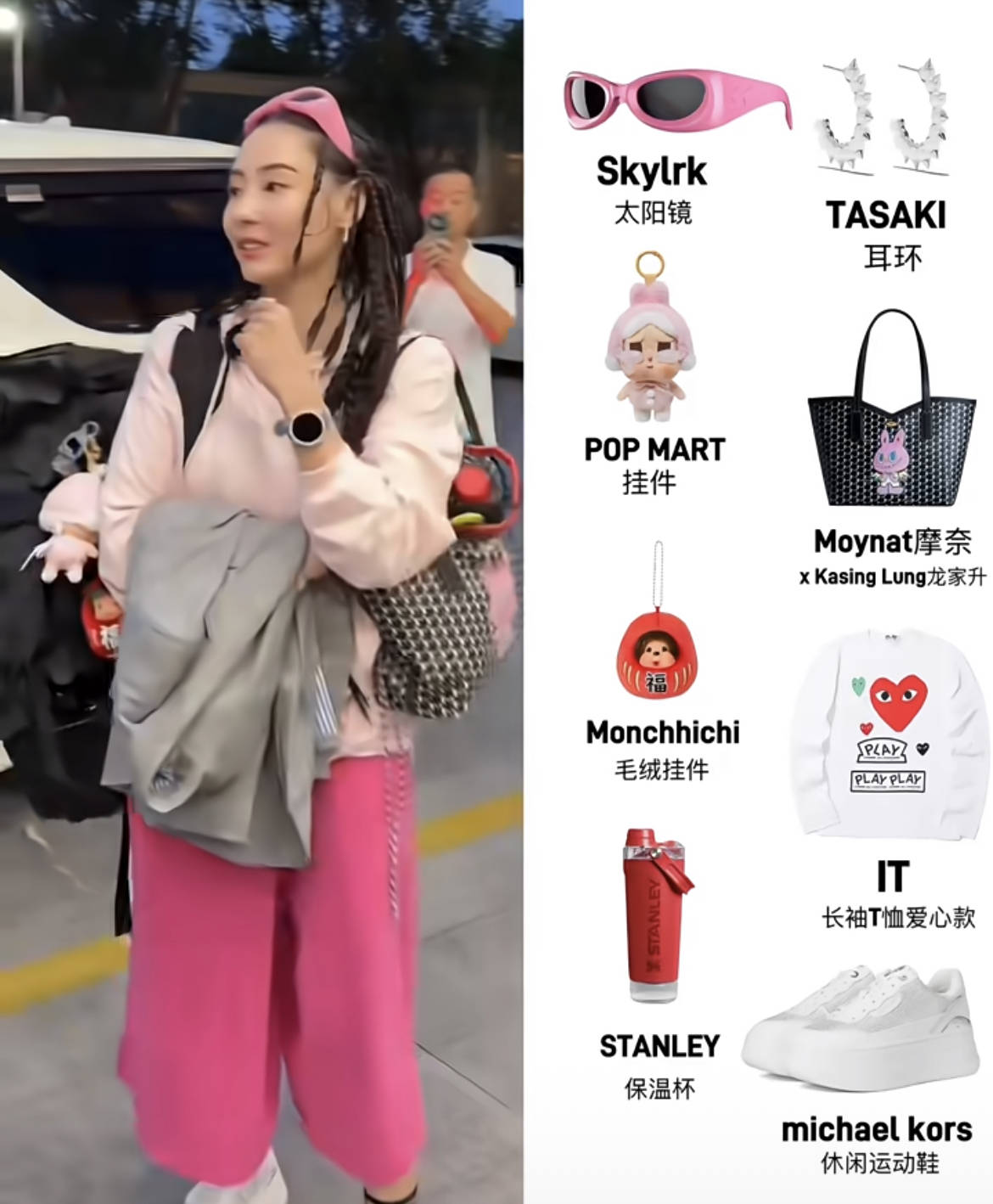 Skylrk粉色墨镜、TASAKI耳环提升精致度,Moynat联名包与泡泡玛特挂件萌趣十足,STANLEY红保温杯做撞色点缀。