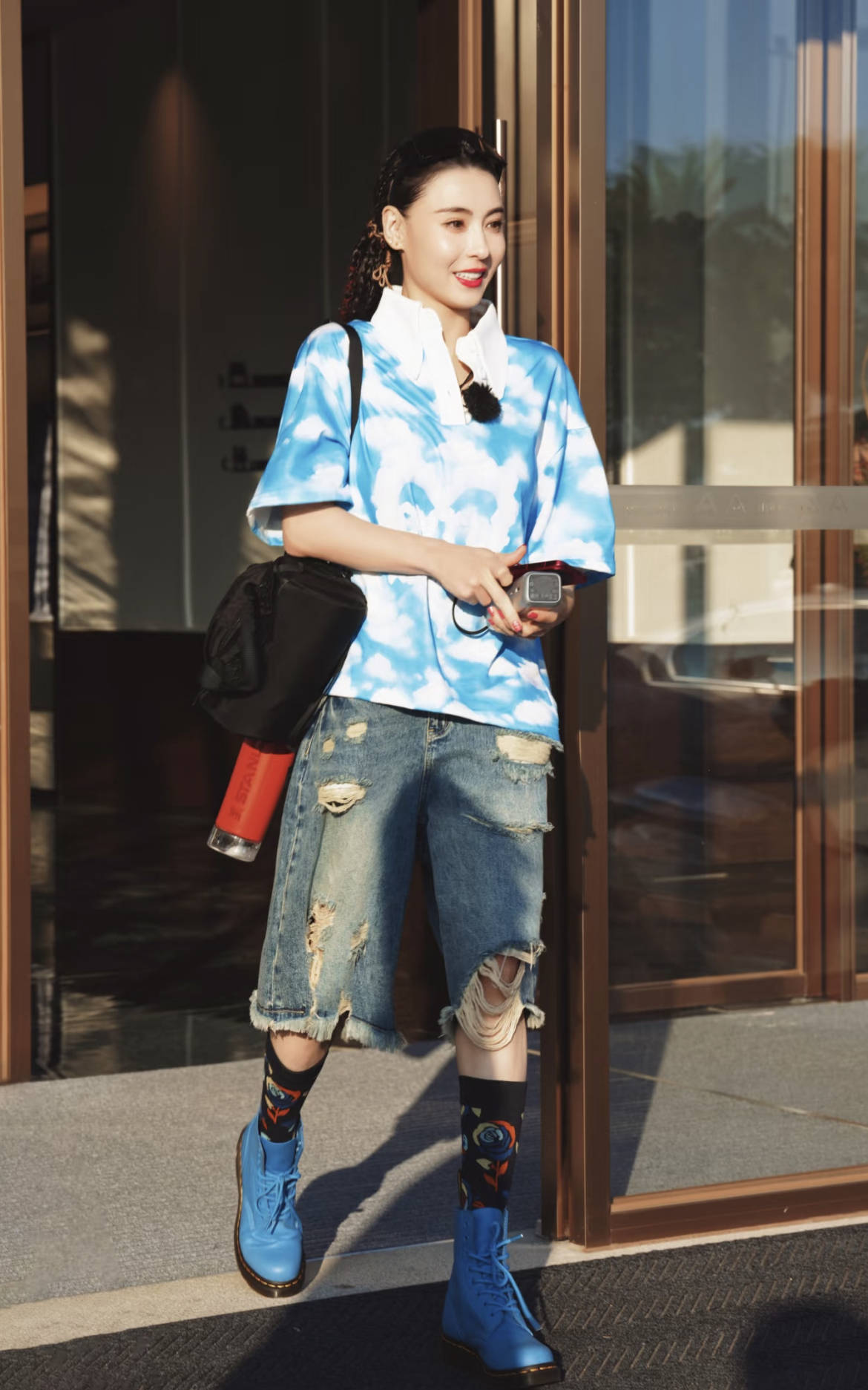 蓝色马丁靴与扎染T恤做色彩呼应,破洞牛仔中裤的毛边设计增加随性,黑色挎包+红色保温杯做小面积撞色,造型更亮眼。