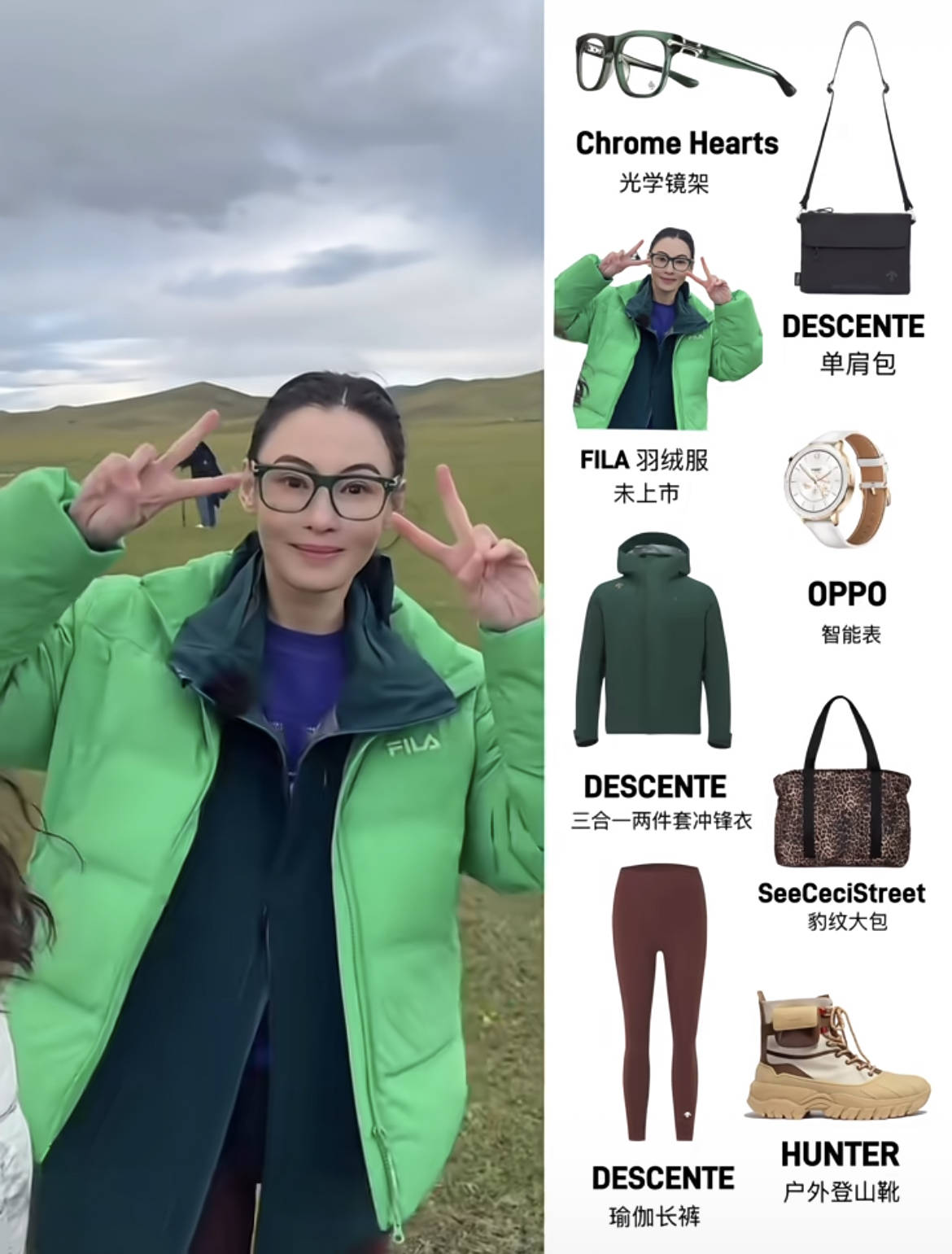 Chrome Hearts黑框眼镜增添文艺感,DESCENTE瑜伽裤+HUNTER登山靴精准踩中户外潮流,豹纹大包和黑色单肩包做配饰混搭,撞色又不杂乱。