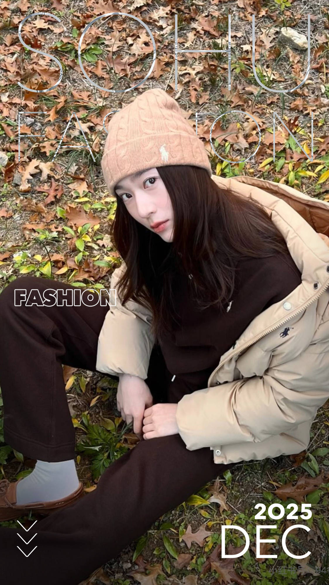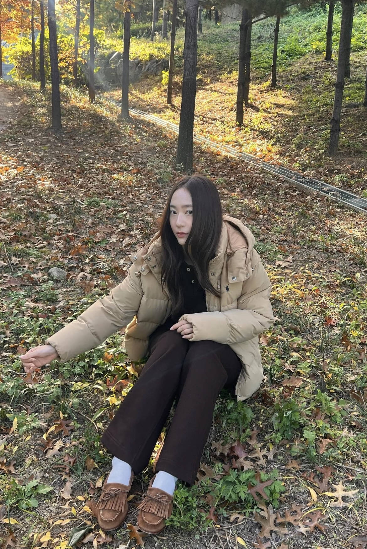 郑秀晶钟爱Ralph Lauren,冬天的羽绒服也不例外,走的是慵懒韩系风,短款浅卡其羽绒服搭配深棕阔腿裤,色彩上的同色系渐变让整体层次分明,不会显得臃肿。流苏乐福鞋+白袜的组合是点睛之笔,中和了羽绒服的厚重感,增添了复古甜妹气质。