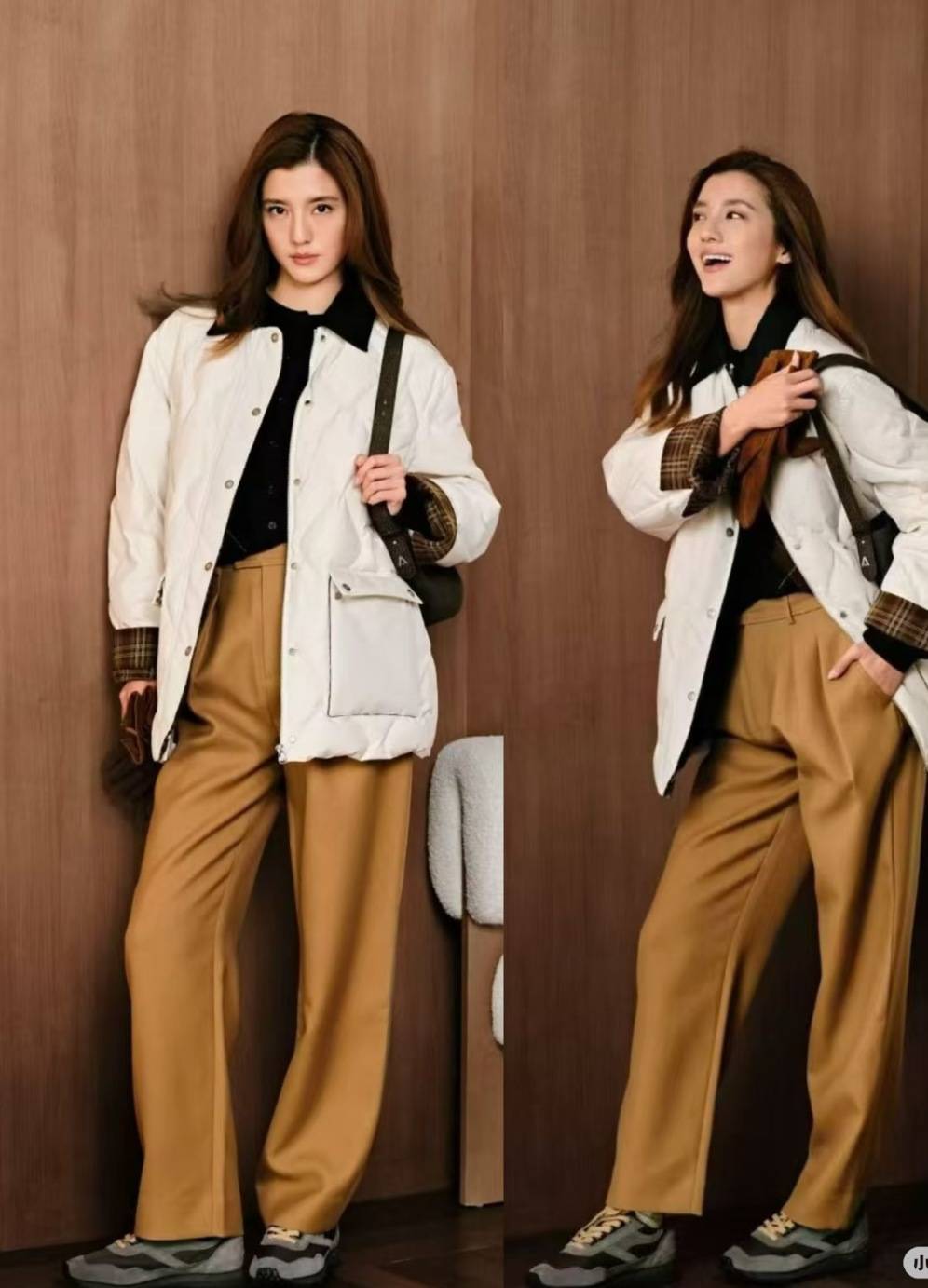 吴千语身穿Marius白黑撞色羽绒服搭配卡其阔腿裤,走的是干练中性风,把羽绒服穿出了“男友风”的随性帅气。这套也很适合打工人日常通勤,宽松裤型+短款羽绒服的组合,兼顾保暖和利落,换双高跟鞋还能秒变轻熟风。