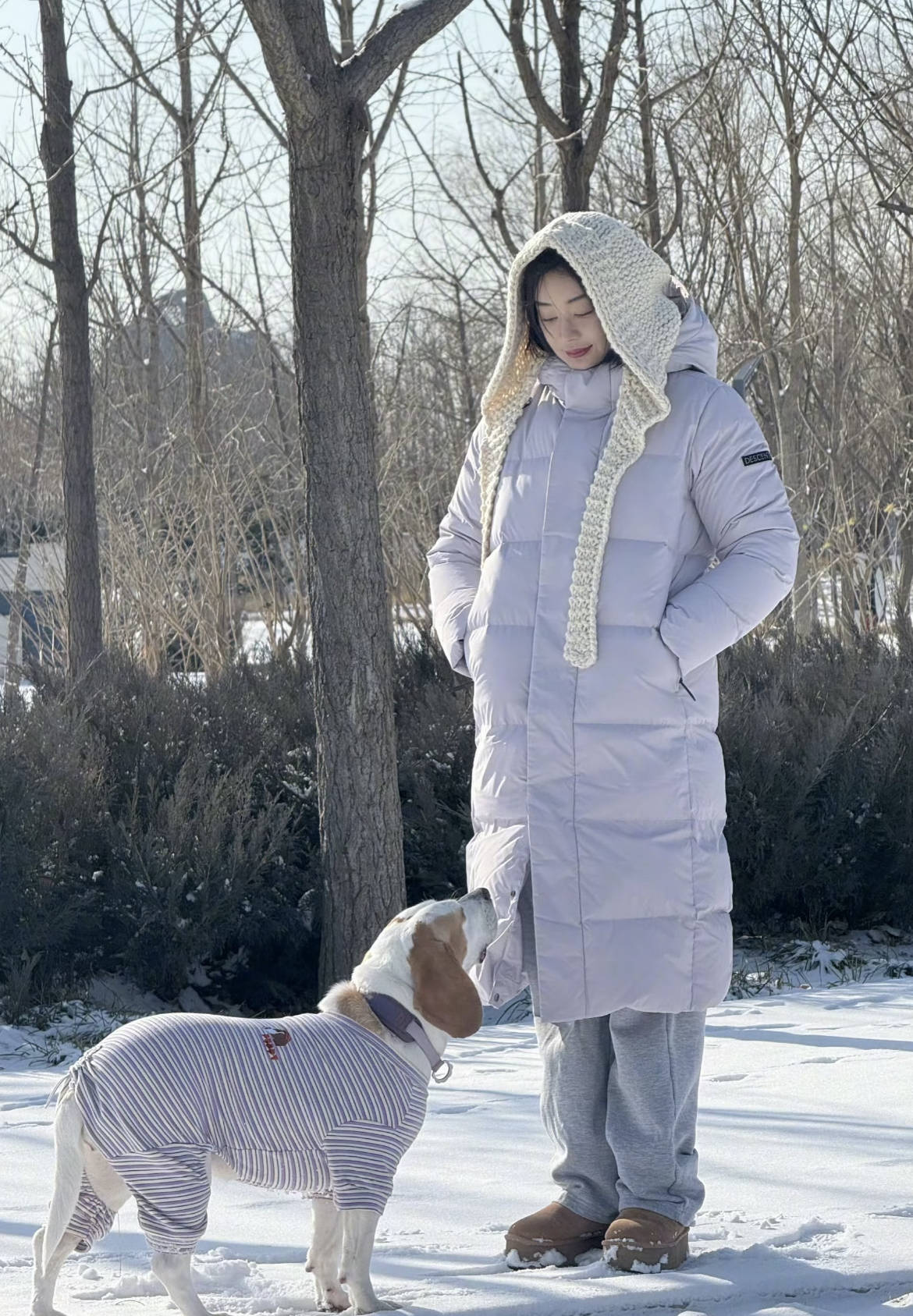 袁姗姗身穿DESCENTE浅紫长款羽绒服搭配灰色运动裤,是冬日“松弛感”又保暖的穿搭范本,温柔又随性,完全没有羽绒服的笨重感。针织连帽围巾和羽绒服的同色系呼应,既增加了保暖度,又让造型更有整体感;雪地靴的搭配接地气,和运动裤的休闲感完美契合。