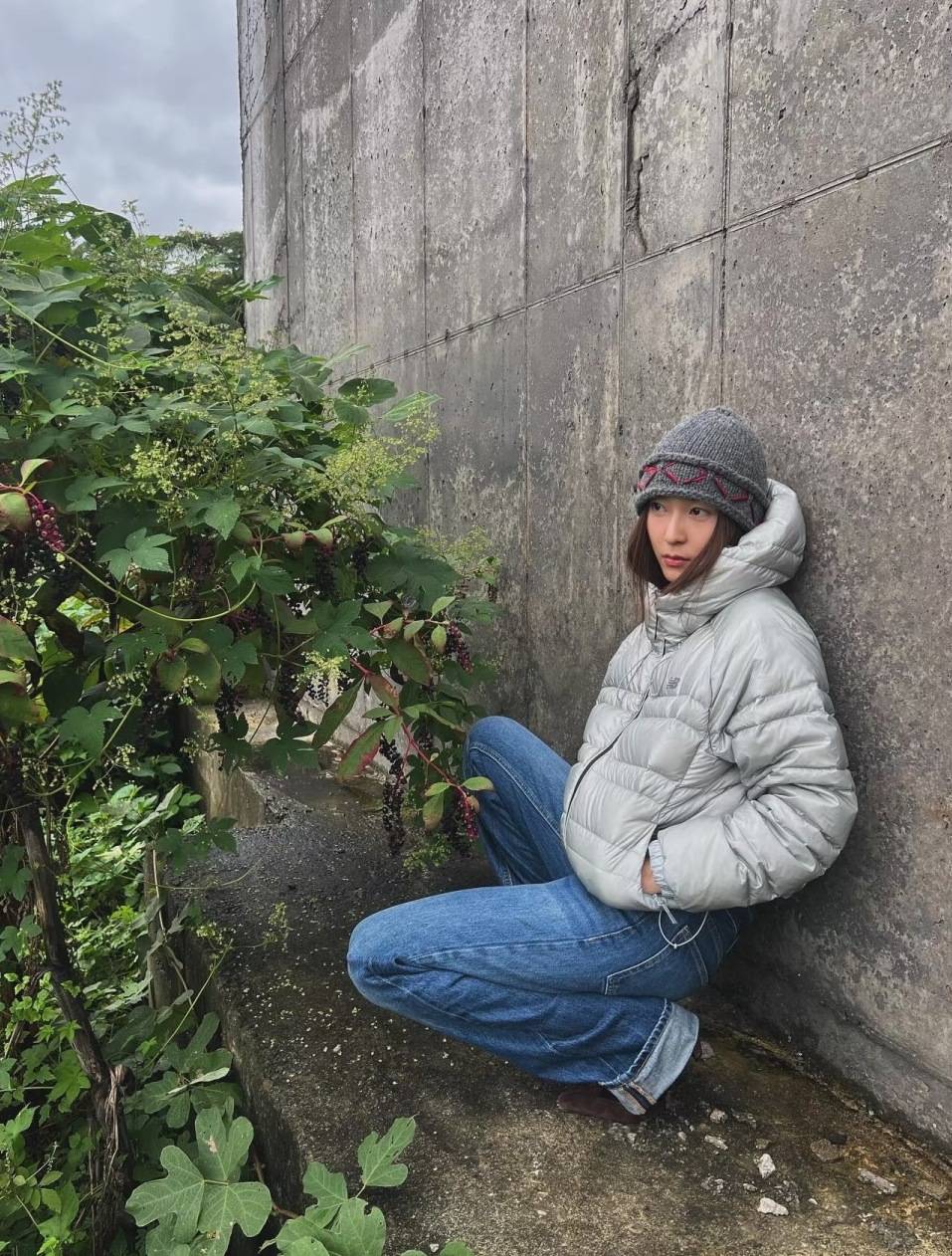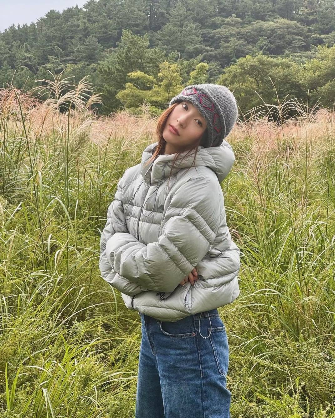 郑秀晶的另一套也很值得借鉴,New Balance的浅灰短款羽绒服+阔腿牛仔裤,是经典的韩系休闲搭配,蹲姿的随性摆拍也让造型更有街头感。