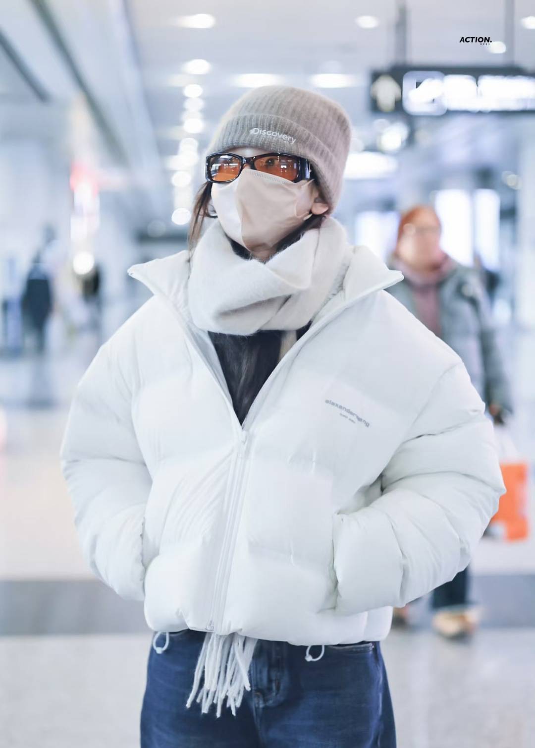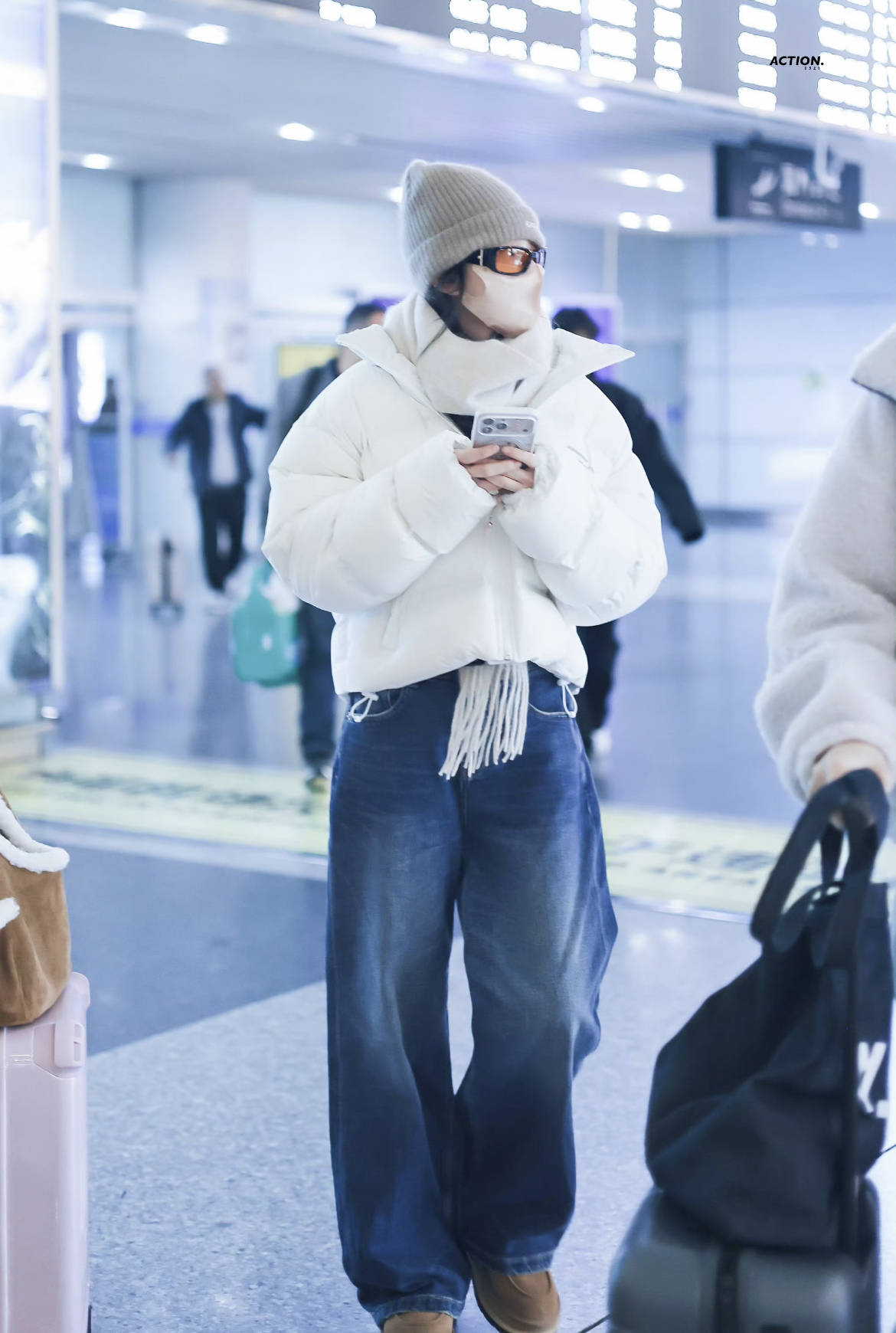 宋祖儿Alexander Wang的白色短款羽绒服,搭配阔腿牛仔裤,是机场穿搭的“时髦懒人法”,保暖又上镜,完全不用费心思。雪地靴的棕色和羽绒服的白色形成撞色,亮眼又不突兀。酷飒又减龄~