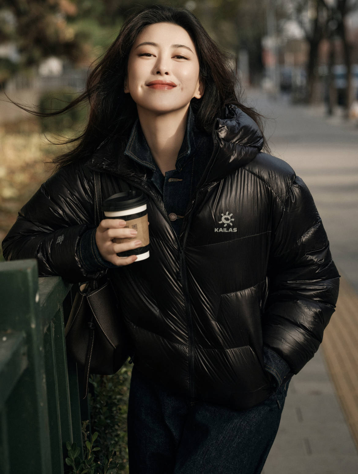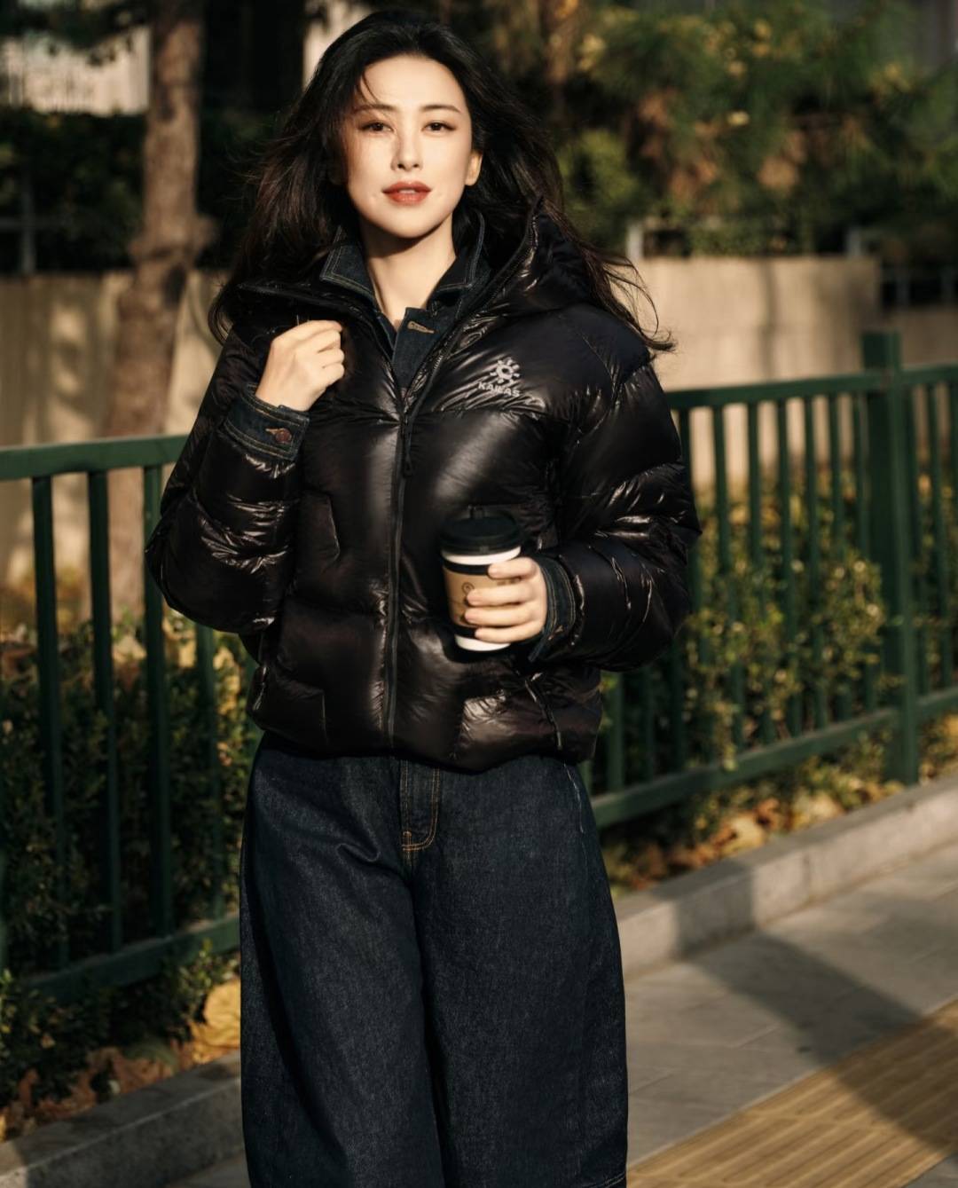 朱珠穿羽绒服照样可以优雅前卫,凯乐石的亮面黑色短款羽绒服搭配阔腿牛仔裤,又干练又彰显好比例,气场拉满。内搭牛仔衬衫的翻领露出,打破了黑色羽绒服的单调,日常且不失格调。