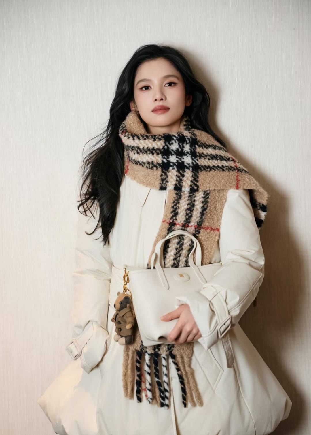 凸显腰线,完全避开了羽绒服的臃肿雷区;白色手提包的搭配增加了精致度。