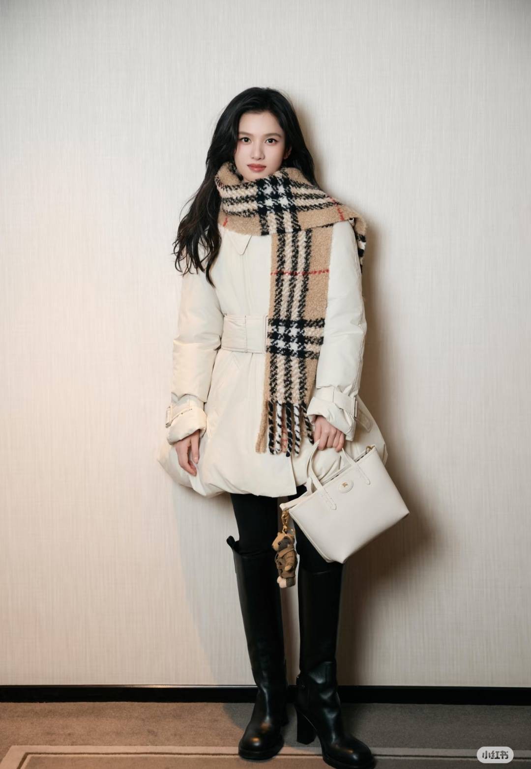 冬日想要甜美一点,可以选择张婧仪这种收腰花苞感羽绒服,Burberry羽绒服搭配黑色紧身裤、过膝长靴,是冬日“又美又暖”的穿搭模板,把羽绒服穿出了“连衣裙”的优雅感。