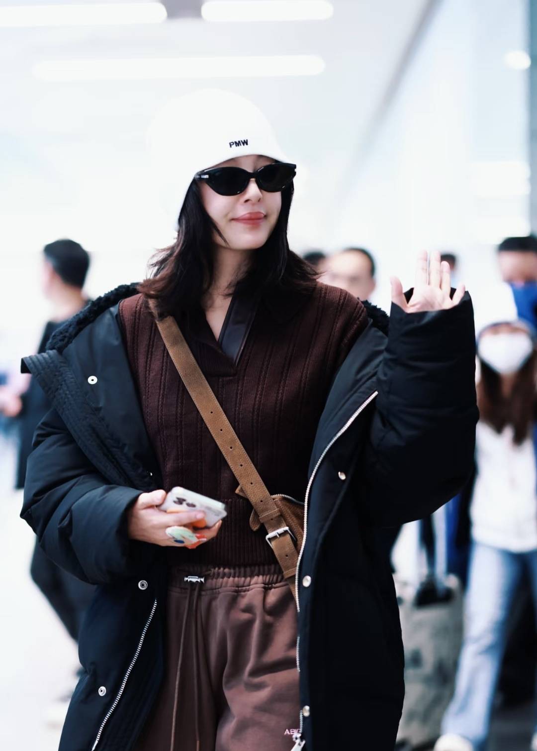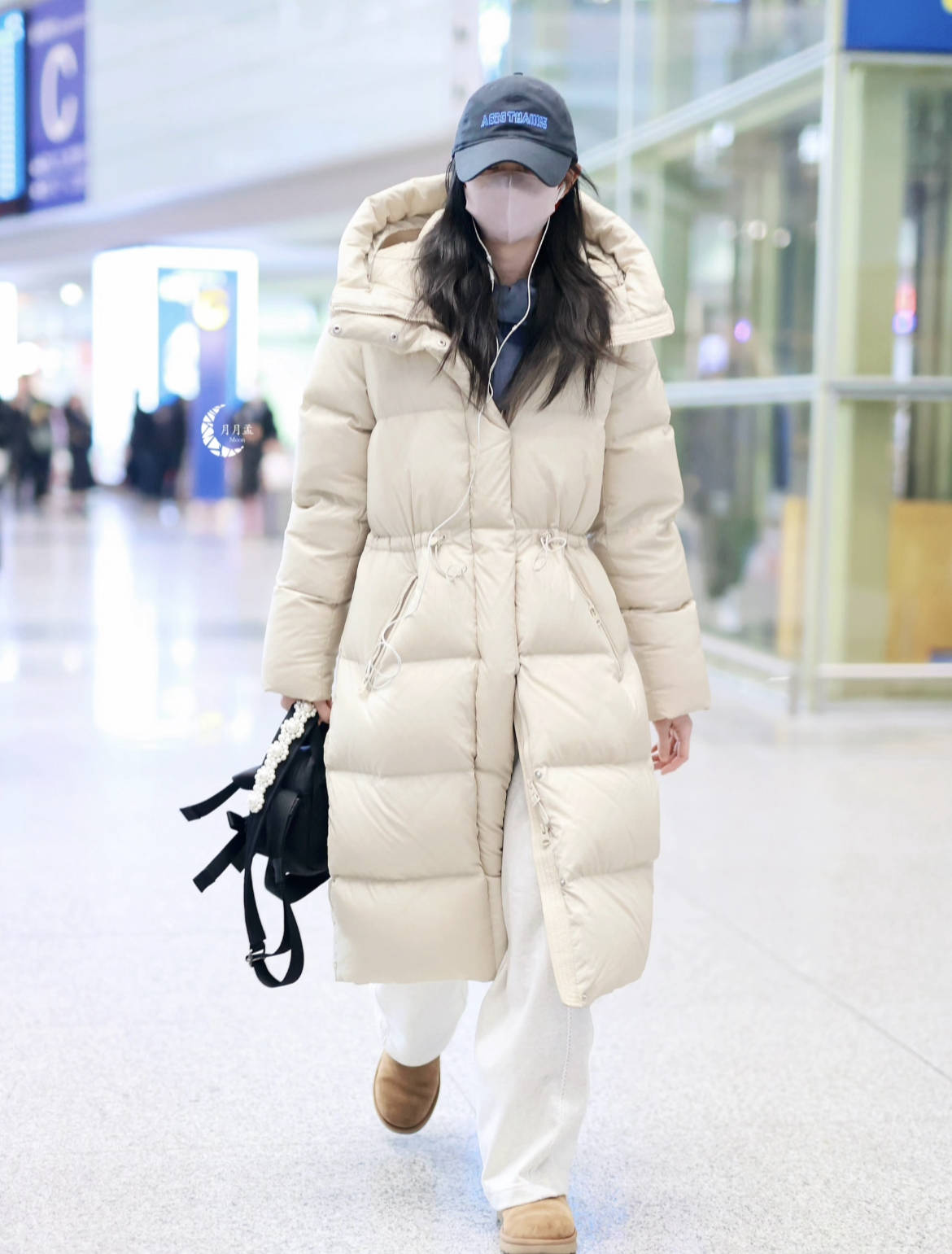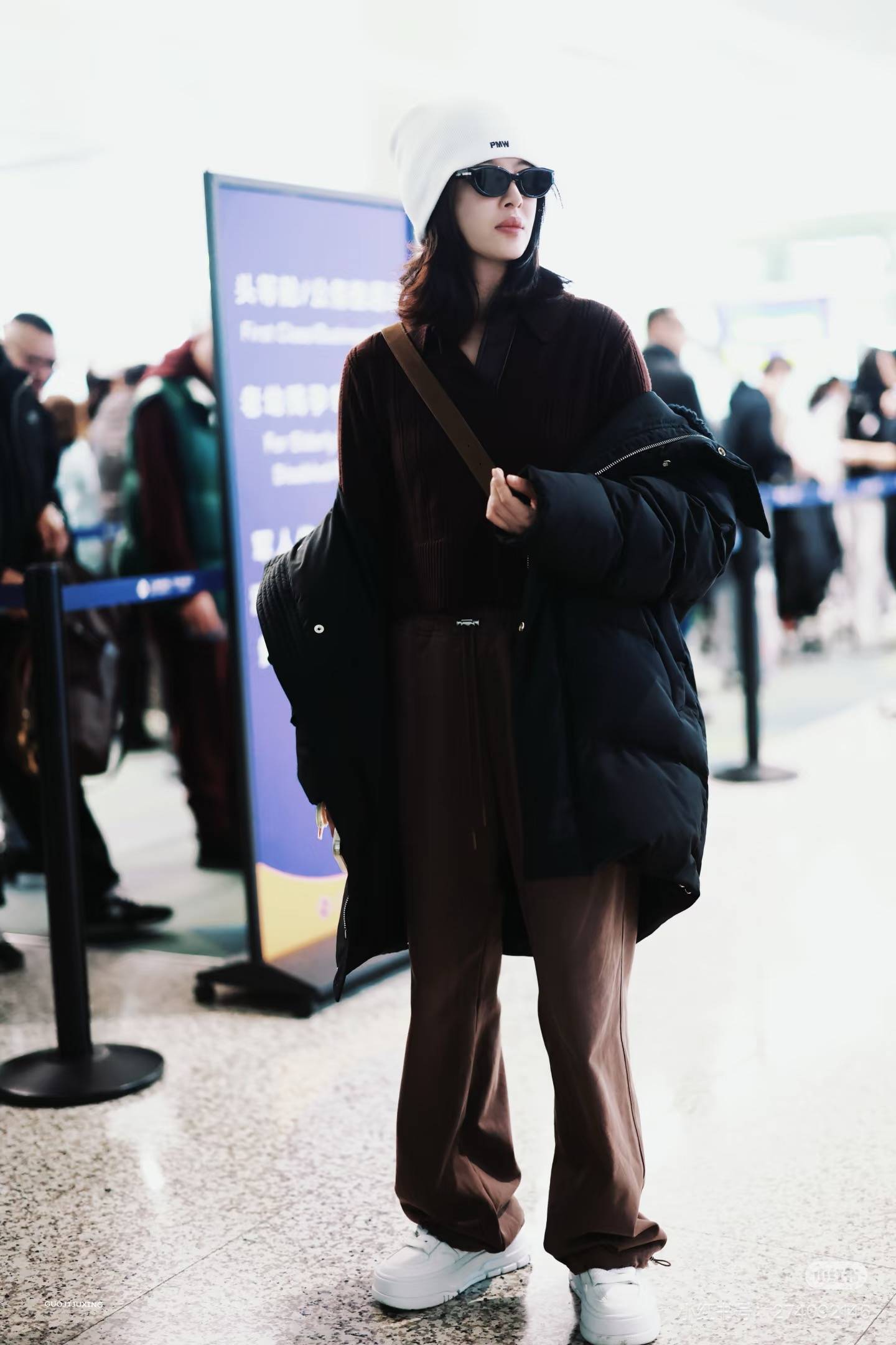 辛芷蕾机场街拍,来自潮牌ABIGTHANKS的黑色长款羽绒服,内搭棕色灯芯绒套装,“叠穿时髦法”的典范,舒适又有层次感,完全不单调。白色运动鞋中和了深色系的沉闷,冷帽和墨镜的配饰让造型更有街头氛围。