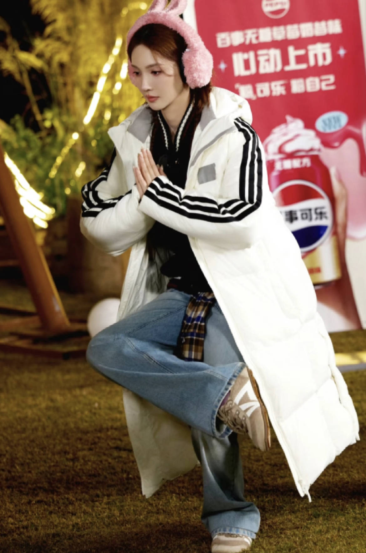 金晨的Adidas白色条纹长款羽绒服自带松弛感,一条阔腿牛仔裤加持,格子衬衫系在腰间,增加了造型的层次,粉色耳罩和羽绒服的白色形成撞色,甜酷又可爱。