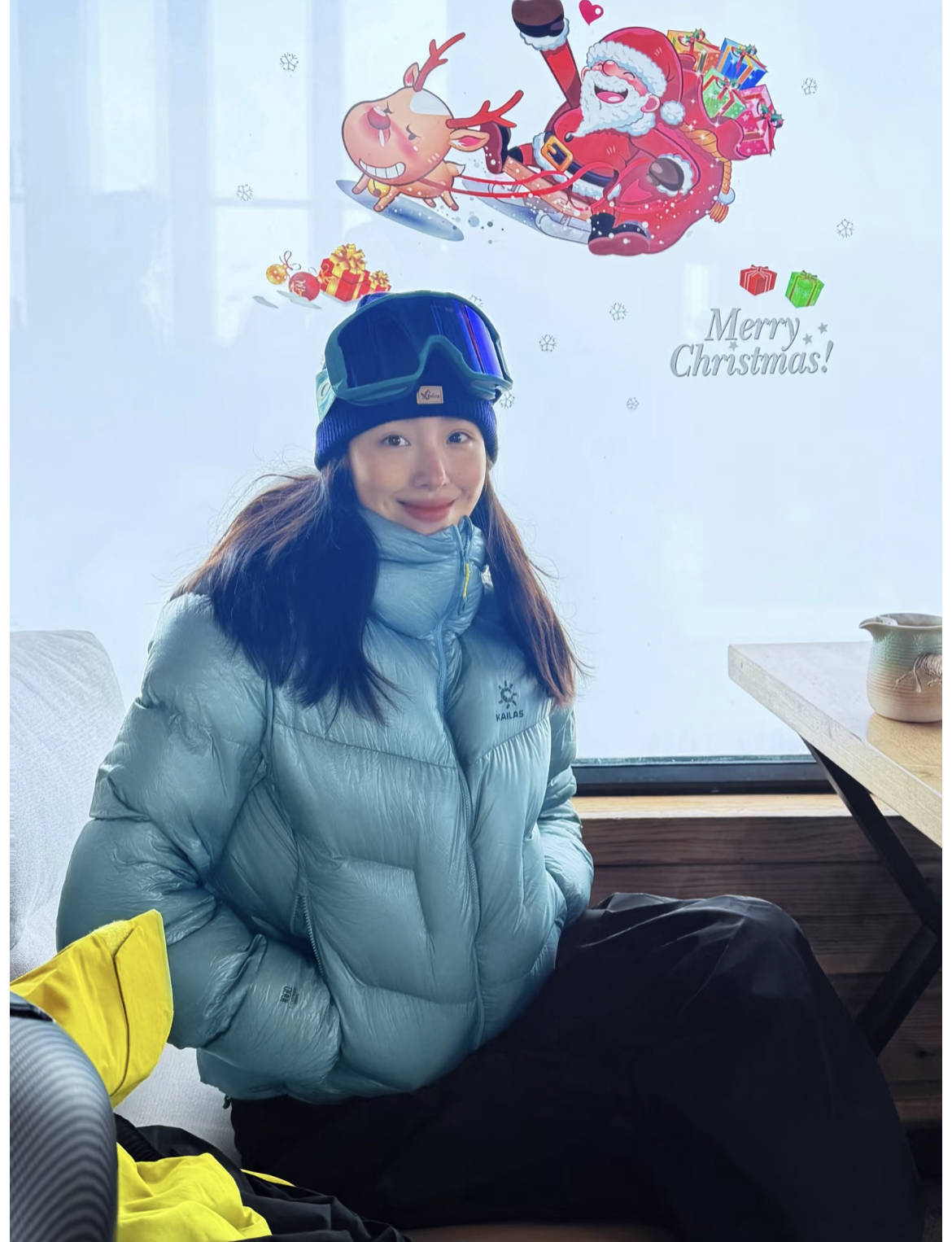 杨采钰示范冬日雪场穿搭,凯乐石的浅湖蓝羽绒服搭配黑色滑雪裤,清爽又有运动活力,滑雪镜+针织帽的专业配饰叠戴,精准拿捏滑雪场景的氛围感,同色系的高领内搭和羽绒服无缝衔接,视觉上拉长颈部线条。