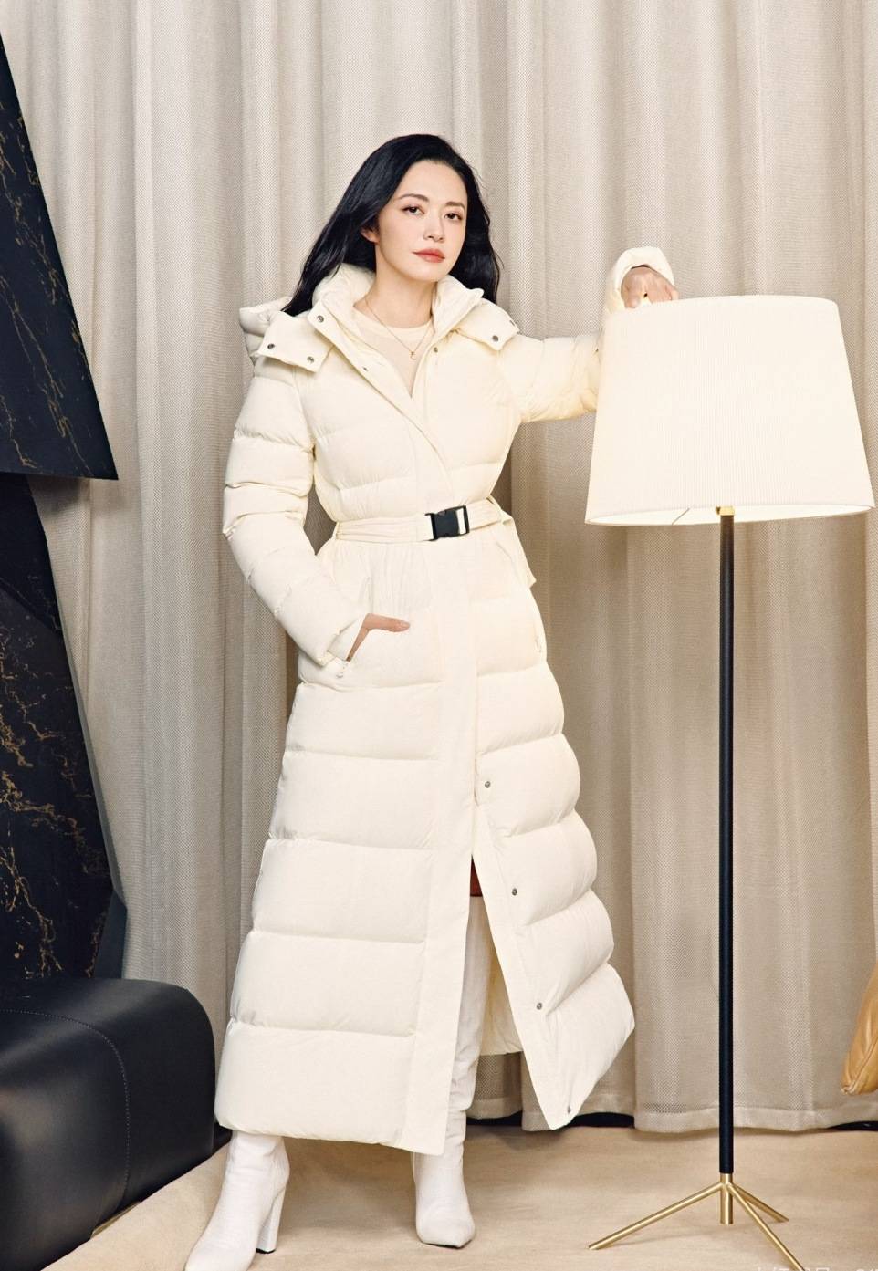 姚晨把白色长款羽绒服穿出了“优雅贵妇风”,也是来自专业羽绒服品牌Mackage,收腰设计让羽绒服变身“冬日战袍”,气场和温度双在线。