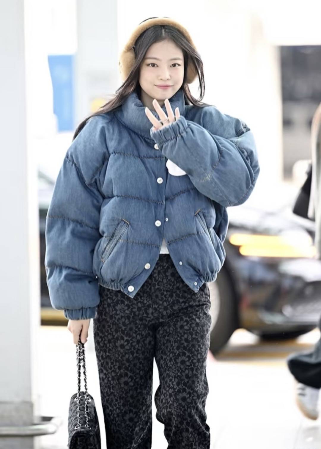 Jennie的蓝色香奈儿羽绒服,可谓是韩系甜酷风的羽绒服穿搭模板,牛仔羽绒服搭配豹纹阔腿裤,复古又吸睛,完全跳出了羽绒服的穿搭套路。毛绒发箍+链条包的配饰,让造型多了几分少女精致感。