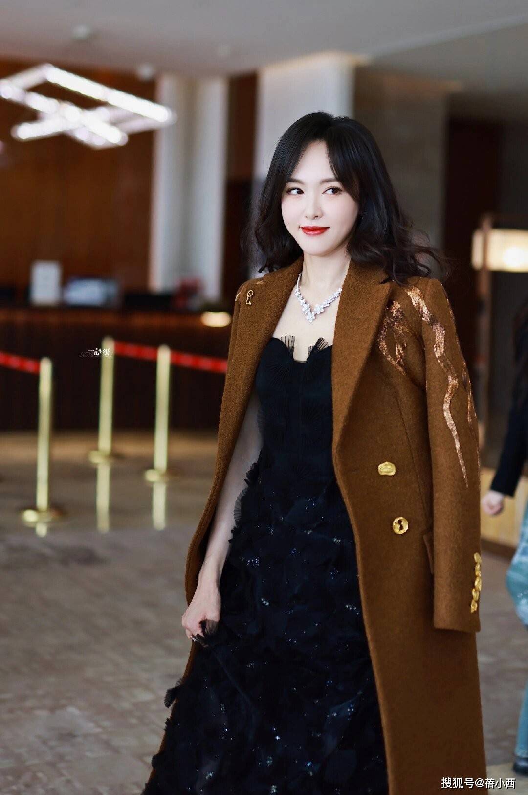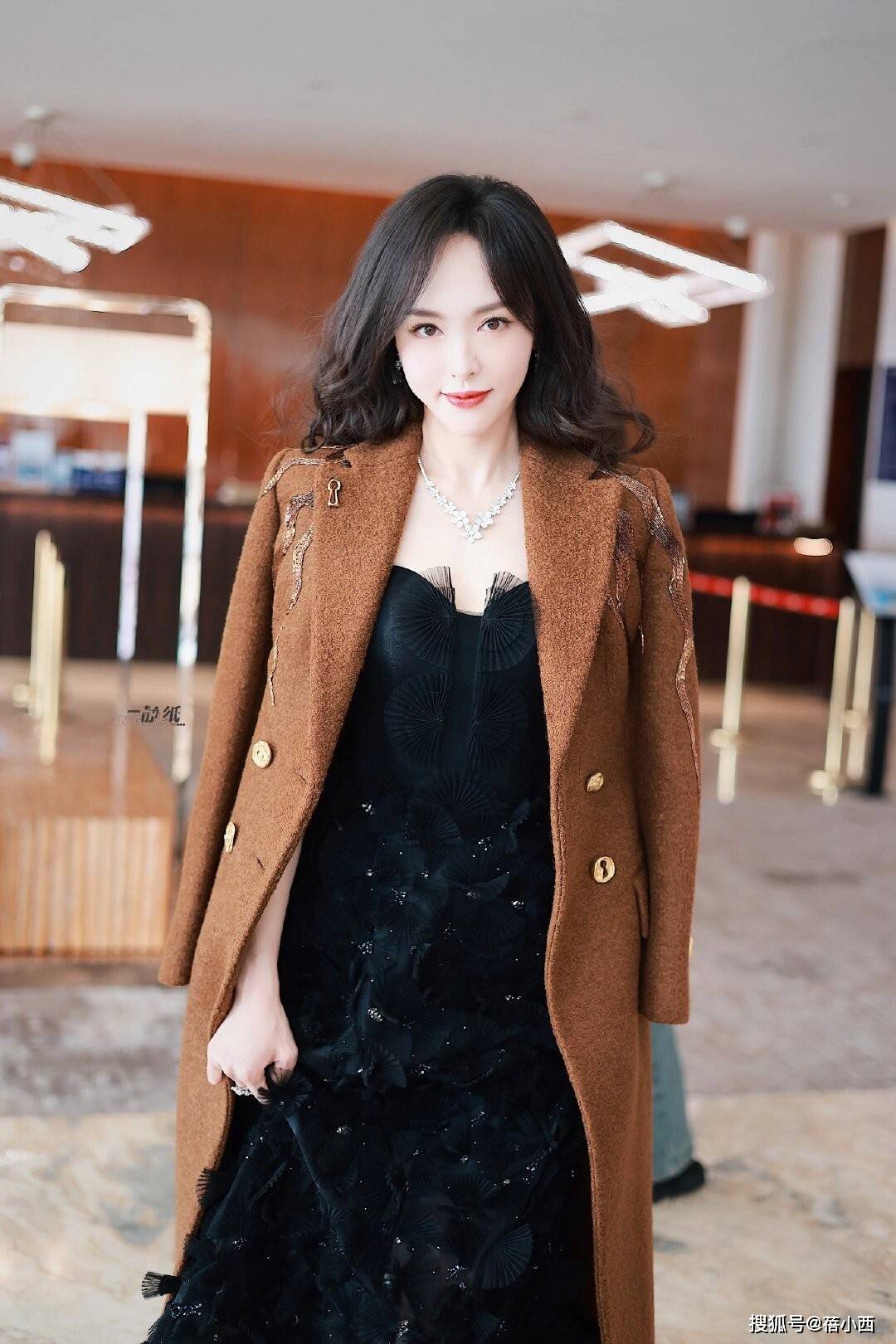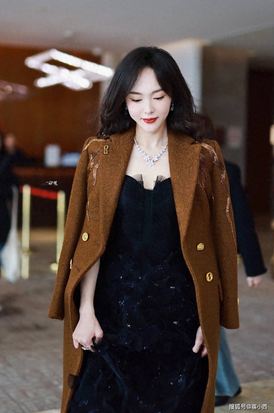 不得不说,唐嫣这套焦糖色大衣搭配黑色连衣裙的造型,堪称秋冬优雅穿搭的天花板,焦糖色毛呢大衣自带复古高级感,挺括的版型勾勒出利落肩线,衣身的金色金属扣与刺绣装饰细节感拉满,打破了纯色大衣的单调,为整体造型增添了精致华丽的氛围。