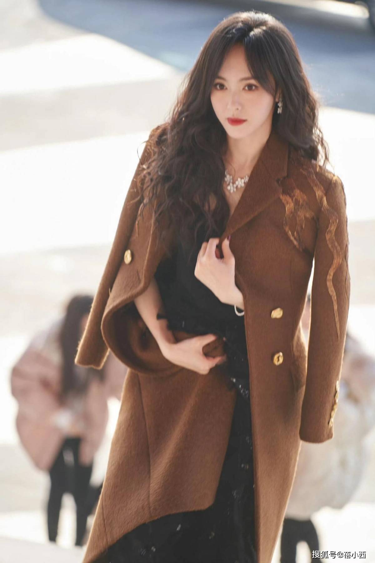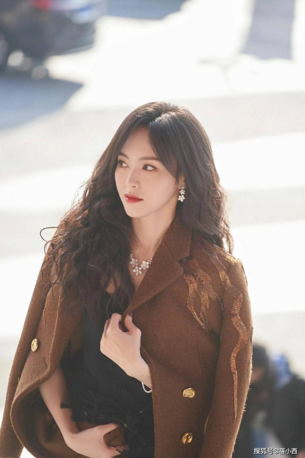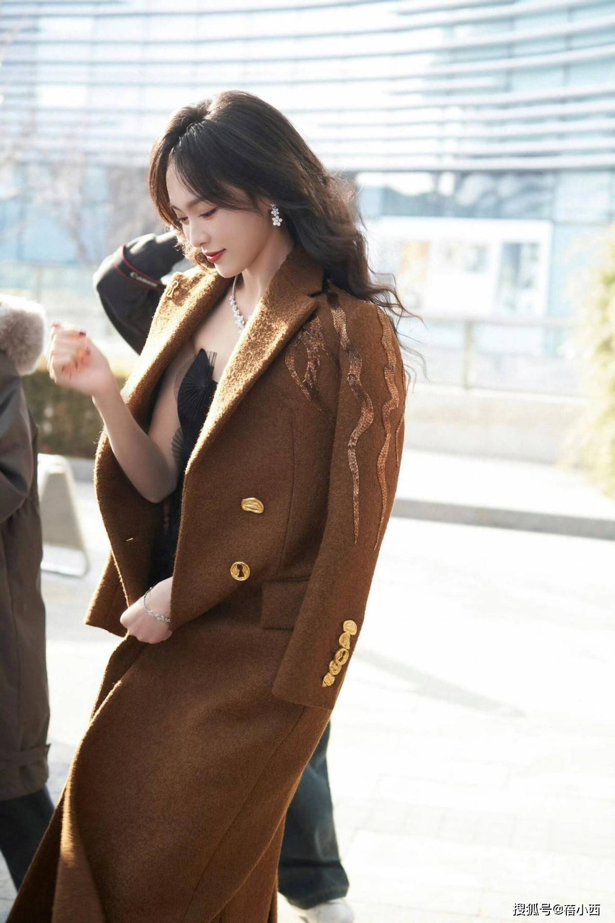 不得不说,唐嫣这套焦糖色大衣搭配黑色连衣裙的造型,堪称秋冬优雅穿搭的天花板,焦糖色毛呢大衣自带复古高级感,挺括的版型勾勒出利落肩线,衣身的金色金属扣与刺绣装饰细节感拉满,打破了纯色大衣的单调,为整体造型增添了精致华丽的氛围。