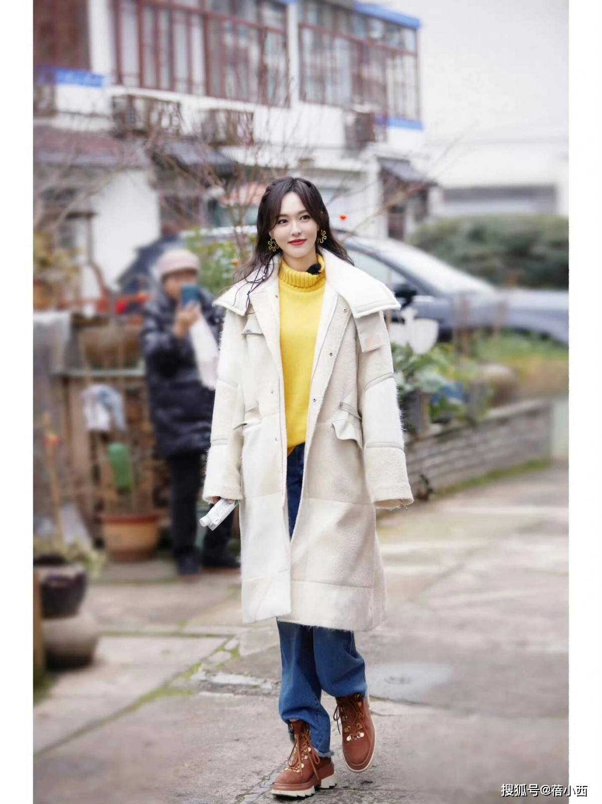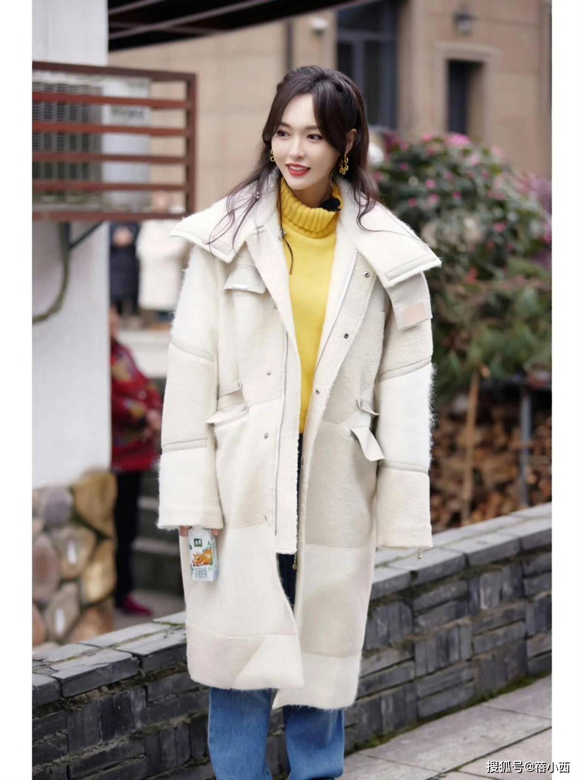 内搭选择明黄色高领毛衣,能瞬间打破冬日的沉闷感,高领设计保暖又修饰颈部线条,与米白羽绒服形成撞色效果,下半身搭配蓝色阔腿牛仔裤,直筒版型修饰腿型还能增加休闲氛围。