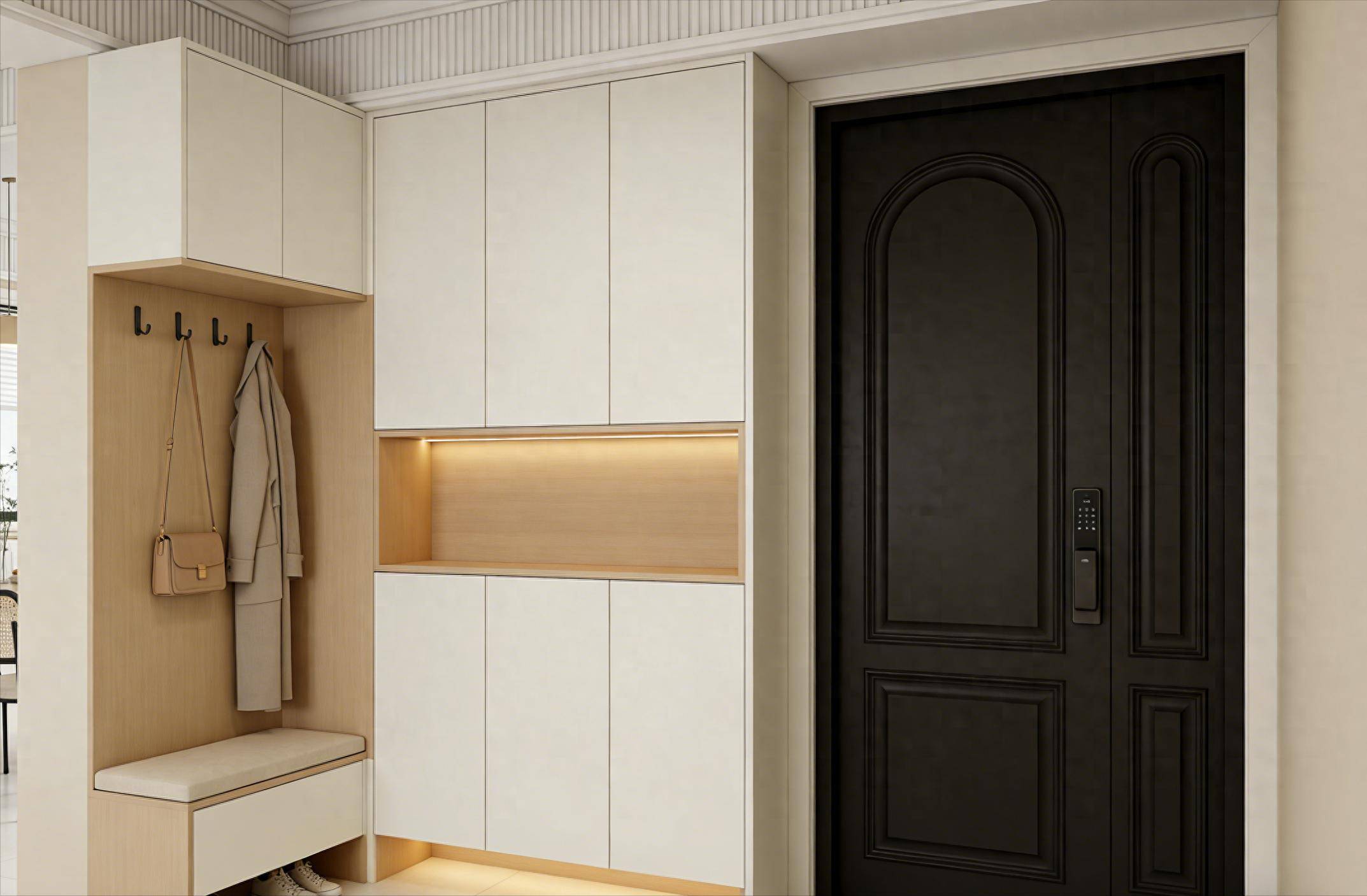 原玄关空间狭窄且无独立收纳,设计师通过墙体微调,打造L型转角鞋柜+餐边柜一体结构,柜门选用奶油白哑光烤漆材质,搭配无拉手设计,柜门门下吊1cm形成隐形扣手,既契合极简调性,又避免磕碰风险。柜体采用“上柜+中部留空+下柜悬空”的科学布局:上柜收纳换季鞋履与杂物,中部留空区域嵌入隐形灯带,方便摆放钥匙、包包等随身物品;下柜悬空15cm,可放置常穿拖鞋,避免地面杂乱。