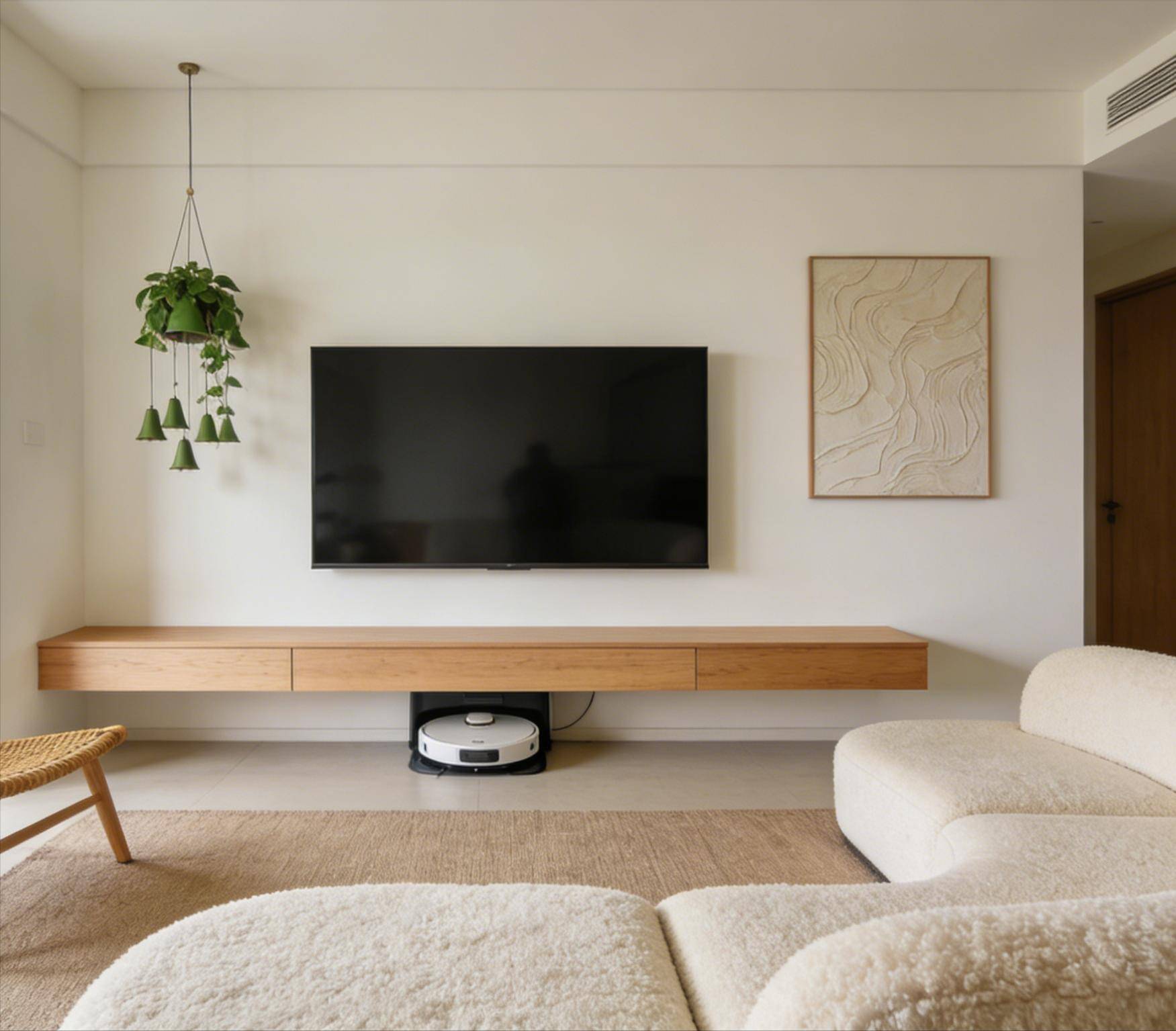 客厅选择米白色弧形羊羔绒沙发,模块化设计适配小空间,坐深55cm的尺寸保证舒适感,搭配浅咖色棉麻地毯与藤编单人椅,柔化空间线条的同时注入自然气息。电视背景墙摒弃复杂造型,保留纯粹的奶白色墙面,搭配悬浮式原木电视柜,下方预留扫地机器人活动空间,整洁又显轻盈。电视柜上摆放一株吊钟绿植与肌理感装饰画,无需过多点缀便充满生机。