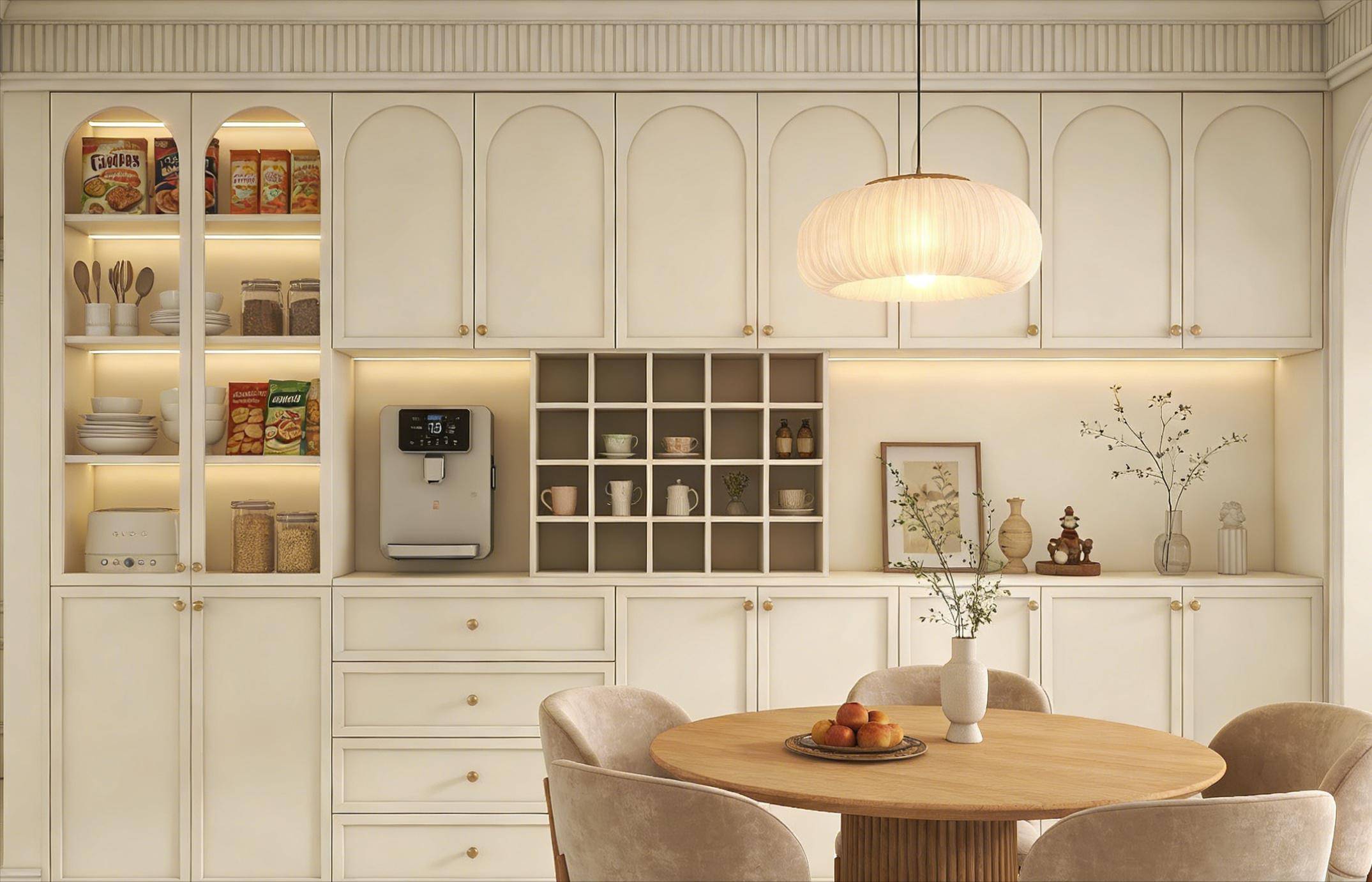 餐厅紧邻厨房,墙面定制一面2m长的通顶餐边柜,柜体与墙面同色,上柜用于收纳餐具、零食等杂物,下柜做抽屉式收纳,中间预留九宫格开放格,摆放小家电与装饰摆件,兼顾收纳与展示功能。餐桌选用浅原木色圆形款,搭配四把绒面餐椅,柔和的材质与圆形造型呼应整体风格,避免直角家具的生硬感;顶面悬挂一盏极简蚕丝吊灯,暖光洒落,让日常用餐充满仪式感。