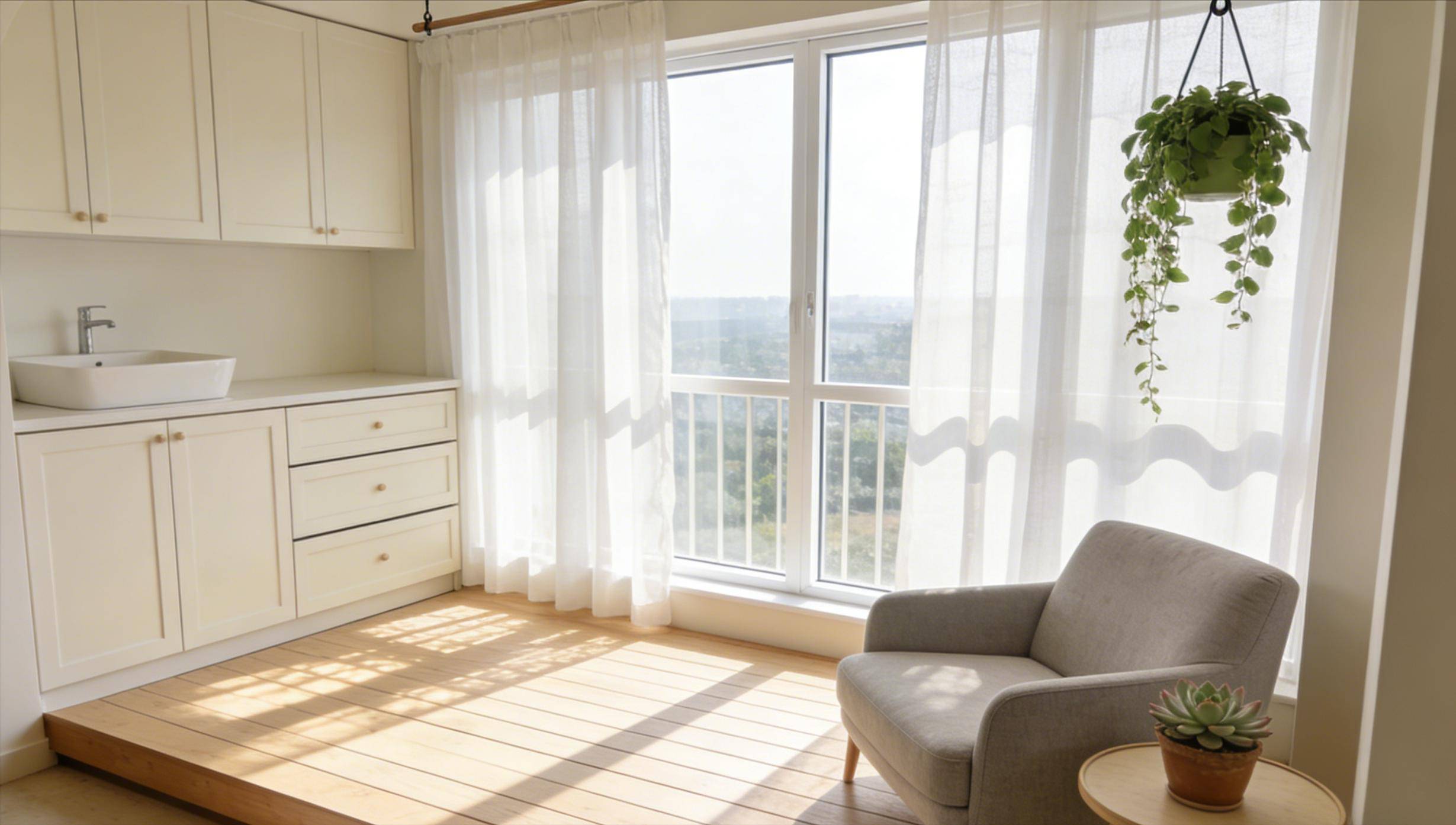阳台与客厅融合后,设计师通过抬高13cm阳台地板打造地台,既巧妙分割两个空间,又增强空间层次感。地台之上安装大落地窗,搭配白纱褶帘,让阳光透过纱帘过滤后变得柔和;角落摆放一张休闲椅与几盆绿植,营造自然惬意的氛围,成为业主午后阅读、放松的专属角落。同时,阳台一侧定制洗衣伴侣柜,整合洗手池与收纳功能,让洗衣、晾晒区域整洁有序,不破坏整体风格统一性。