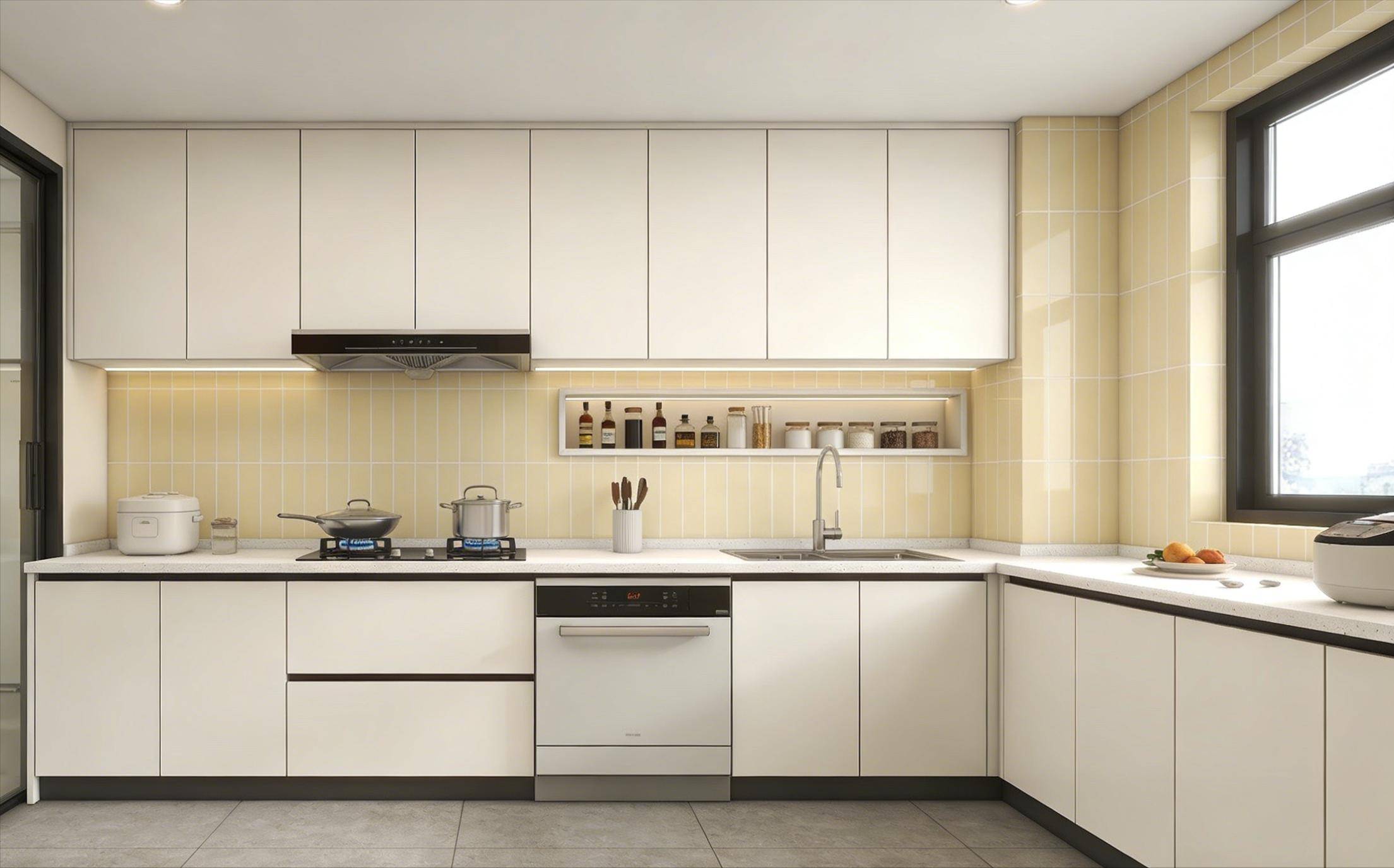 厨房采用封闭式设计,避免油烟扩散影响客餐厅。地面铺水泥灰哑光砖,耐脏易打理;墙面贴象牙黄亮光小方砖,与白色PET柜门橱柜形成鲜明对比,整洁又明亮。橱柜做高低台面设计,炒菜区高度80cm,洗菜区高度90cm,契合人体工学,减少烹饪疲劳;台面选用白色石英石,下挂2cm无挡水条,线条利落不藏污纳垢。