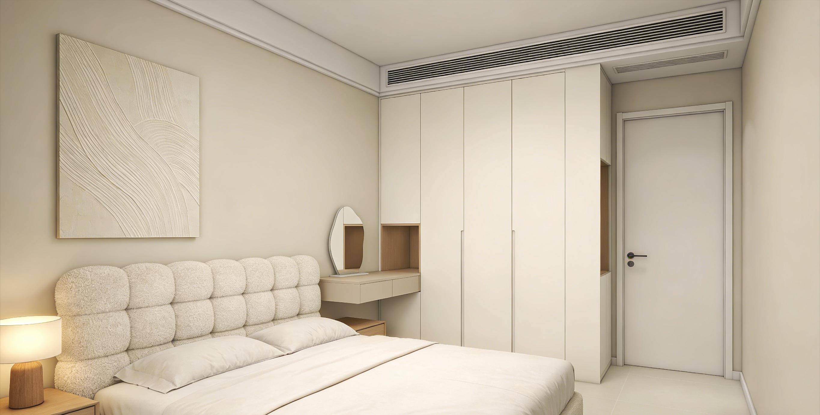 主卧面积约13㎡,墙面通刷杏子灰乳胶漆,顶面做简单双眼皮吊顶,搭配奶白色棉花糖软包床,1.8×2m的尺寸满足舒适需求,羊羔绒材质的靠背柔软亲肤,营造“被包裹”的安全感。床头两侧摆放极简原木床头柜,搭配小巧的暖光台灯,墙面悬挂一幅浅色系肌理画,无需多余装饰便打造出静谧的舒眠氛围。