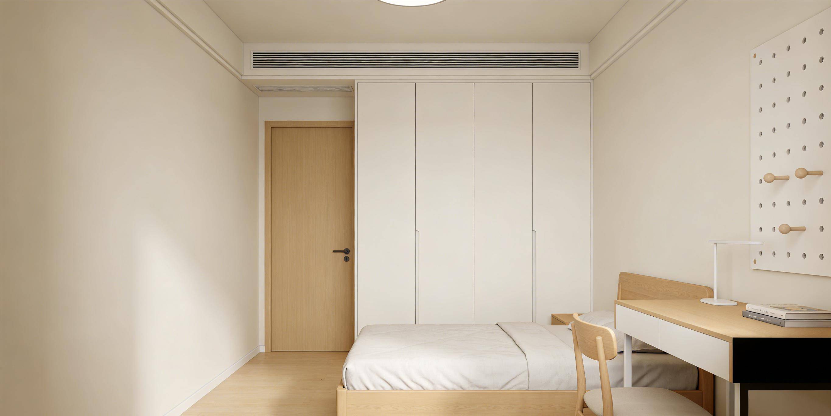 次卧(儿童房预留)面积约8㎡,整体延续奶油风基调,墙面刷浅米色乳胶漆,地面通铺浅原木色哑光地板,脚感温润。空间采用“定制衣柜+灵活家具”布局,衣柜做嵌入式设计,奶白色柜门搭配隐形拉手,与墙面融合;目前摆放一张1.2m原木色单人床与简易书桌,预留足够活动空间,未来可根据孩子性别与年龄调整软装,打造专属儿童房。
