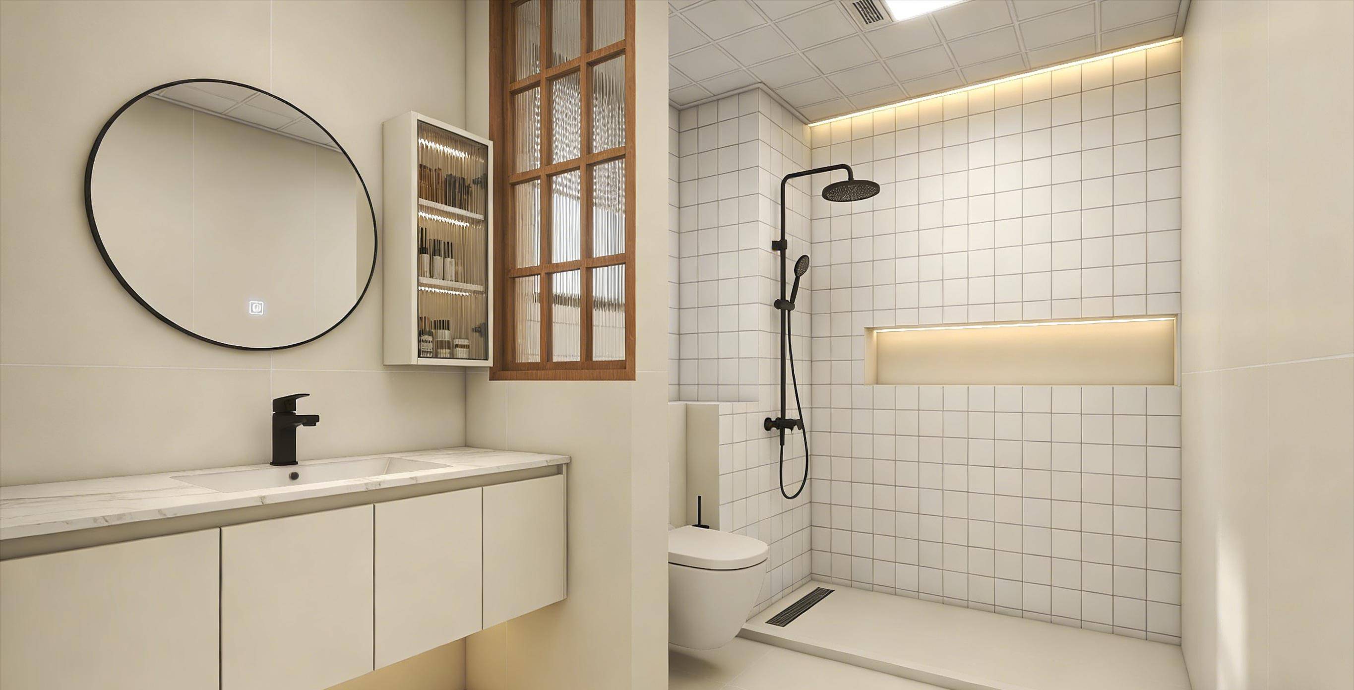 湿区选用壁挂式马桶,节省地面空间且便于清洁;墙面贴白色方形哑光砖,搭配黑色五金件,形成冷暖对比,精致又耐看;淋浴区墙面开辟壁龛,放置沐浴露、洗发水等物品,保持墙面整洁。顶面采用防水石膏板吊顶,搭配暖光洗墙灯,让小空间在柔和光线中更显通透;地面做微斜坡设计,搭配线性地漏,排水顺畅不积水。