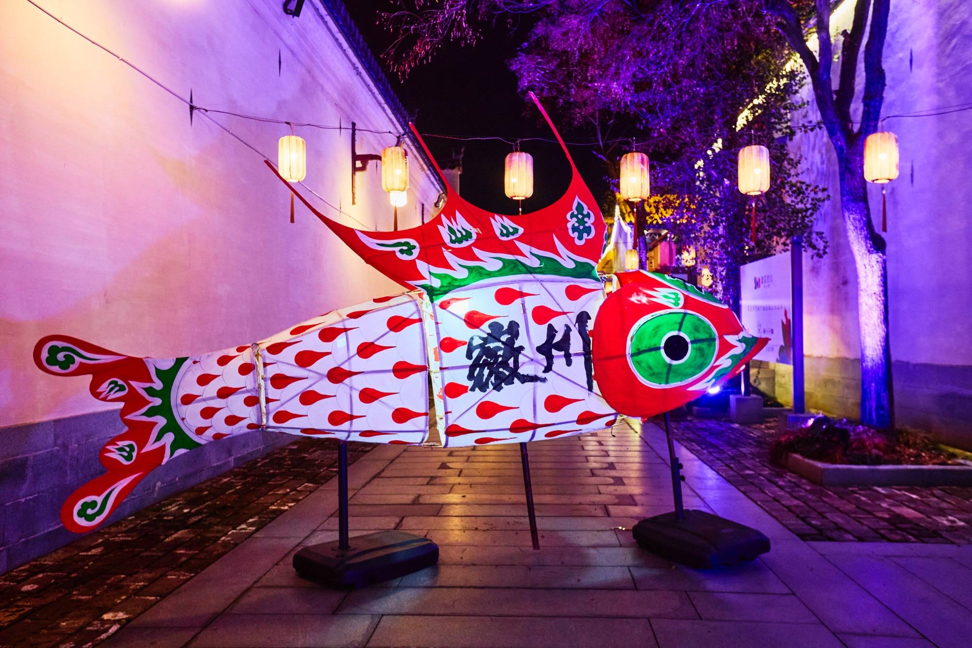 初升的月亮仿佛一个信号,夜色渐浓时,街巷里的徽州鱼灯便亮起灯光。白色鱼身点缀着红色鳞片,碧绿的眼睛灵动传神,白色光晕从薄纸中透出,在紫蓝色的灯光映衬下,仿佛是从画里游出来的锦鲤,美得灵动。