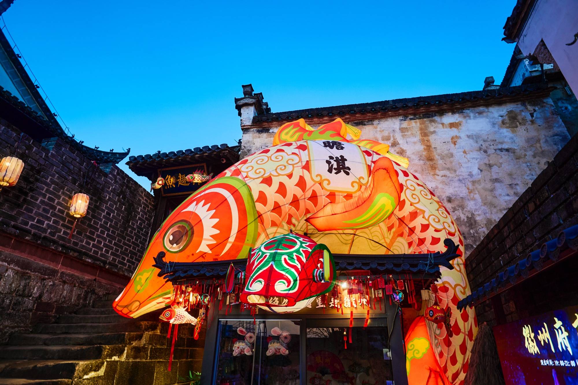 巨型鱼灯拱门后是斑驳粉墙,古朴感扑面而来。橙红相间的鱼身布满繁复花纹,从鱼灯下穿过,仿佛就一脚踏进了千年徽州梦。