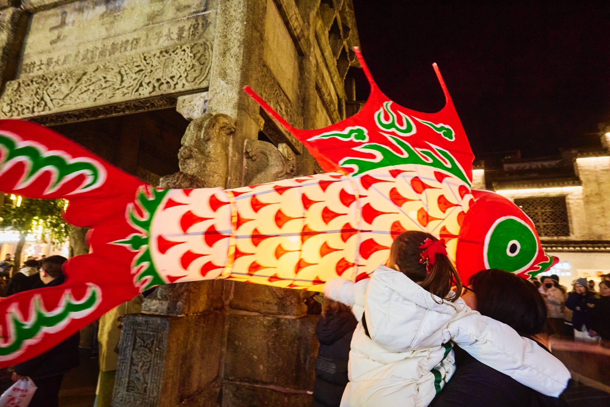鱼灯巡游是古城最热闹的时候,红彤彤的鱼灯穿梭在青石板巷上,从许国石坊前缓缓游过,鱼身的光影在石坊的雕刻上流转,欢声笑语不断,古徽州的浪漫与热闹在这里交融。