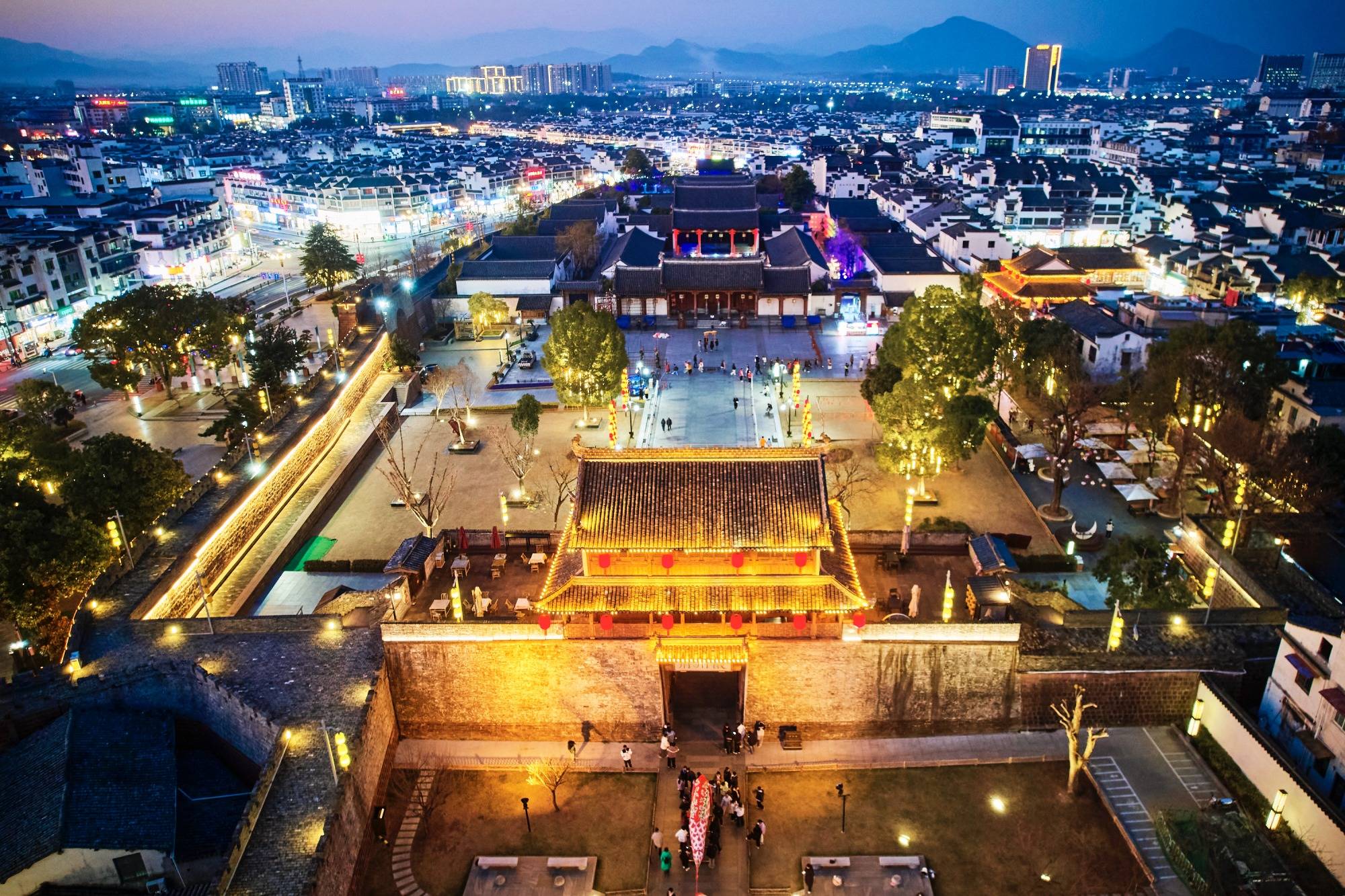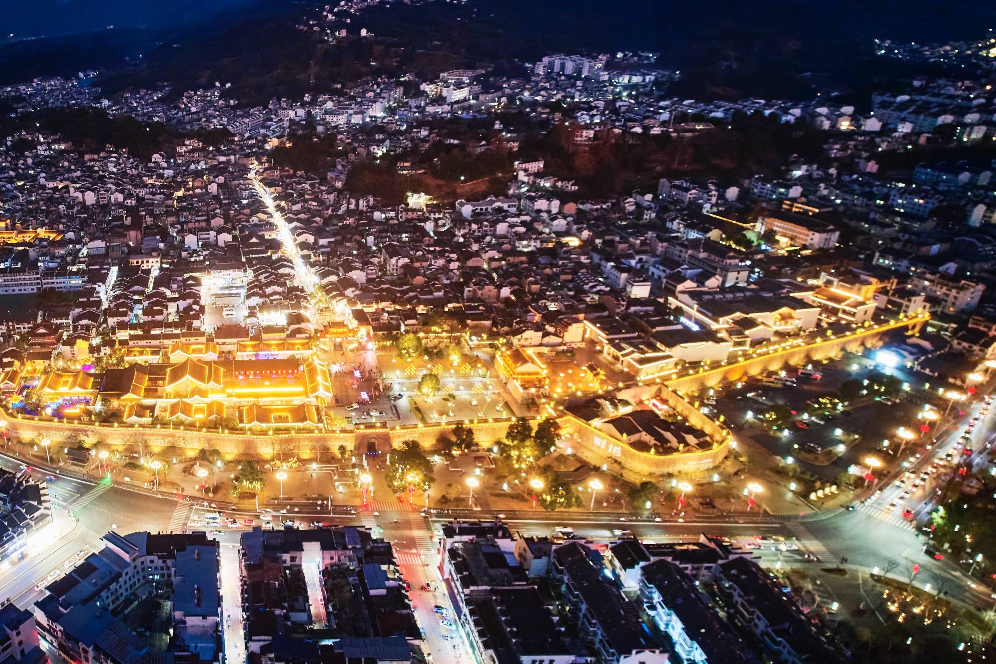 从高处俯瞰徽州古城,满城灯火映着古朴雅致的徽派建筑,远处山峦勾勒出温柔的轮廓,见山,见水,见灯火,这是徽州人刻在骨子里的浪漫。