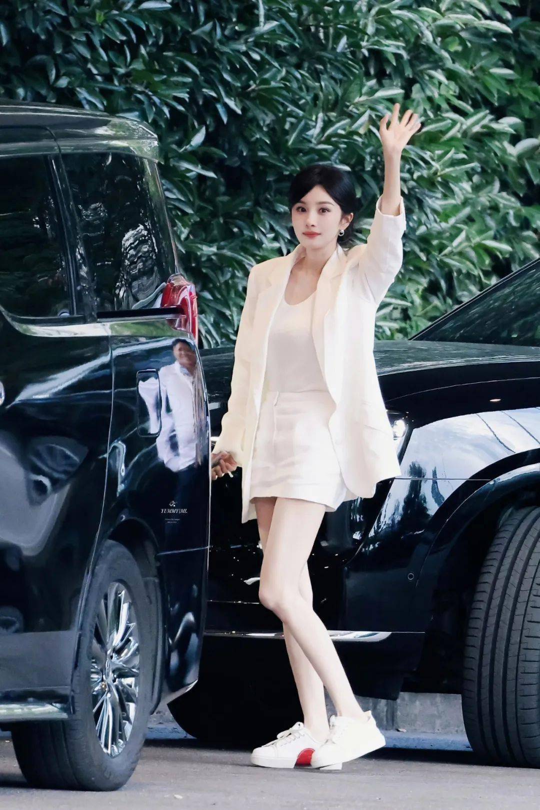 这套白衣look其实很有讲究。西装外套宽松随性,内搭无袖上衣和短裤保持利落,运动鞋的加入削弱了正式感,更适合日常参考。杨幂的姿势也很妙:有时搭着车尾,有时轻靠后视镜,身体微侧,眼神直视镜头。没有夸张动作,却每一张都显得身段挺拔。网友光盯着局部争论“看腿还是看身材”,但时尚博主看来,整体气质才是关键。她38岁的状态里,有少女的轻盈,也有成熟女性的从容,这比单一部位更吸引人。