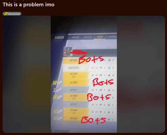 近日,Reddit用户SignalDifference348分享了一张自己的对战记录截图,并逐一标出了他认为对手阵容由机器人组成的比赛。他表示,这已经成为当前游戏中的一个明显问题。