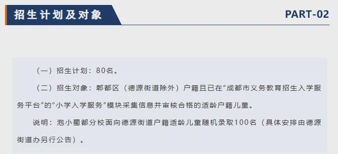 泡小蜀都也是面向全区户籍儿童摇号,德源街道和其他街道分开摇号,录取计划以德源街道为主。去年,学校在德源街道随机录取100个人,现场抽签;其他街道的娃娃需要自主报名,录取80个人。