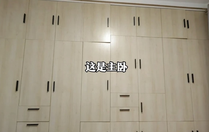 不止工艺有问题,这设计的审美更是一言难尽(其实压根也没什么设计),就拿主卧的衣柜来说,各种收纳格和挂衣区乱七八糟堆在一起,完全没有任何章法,更别说考虑板材的美观和实用性了,一塌糊涂。