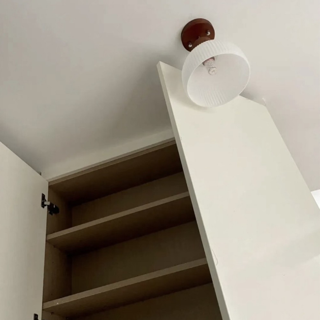 临近柜子的位置,还有个离谱的吊灯——因为柜子做了通顶式设计,但他却忘了预留出吊灯位置,结果就是装了吊灯以后和柜门打架,哪怕再往外移10厘米,也不会出现这种问题,现在只能是柜门半开凑合用了。