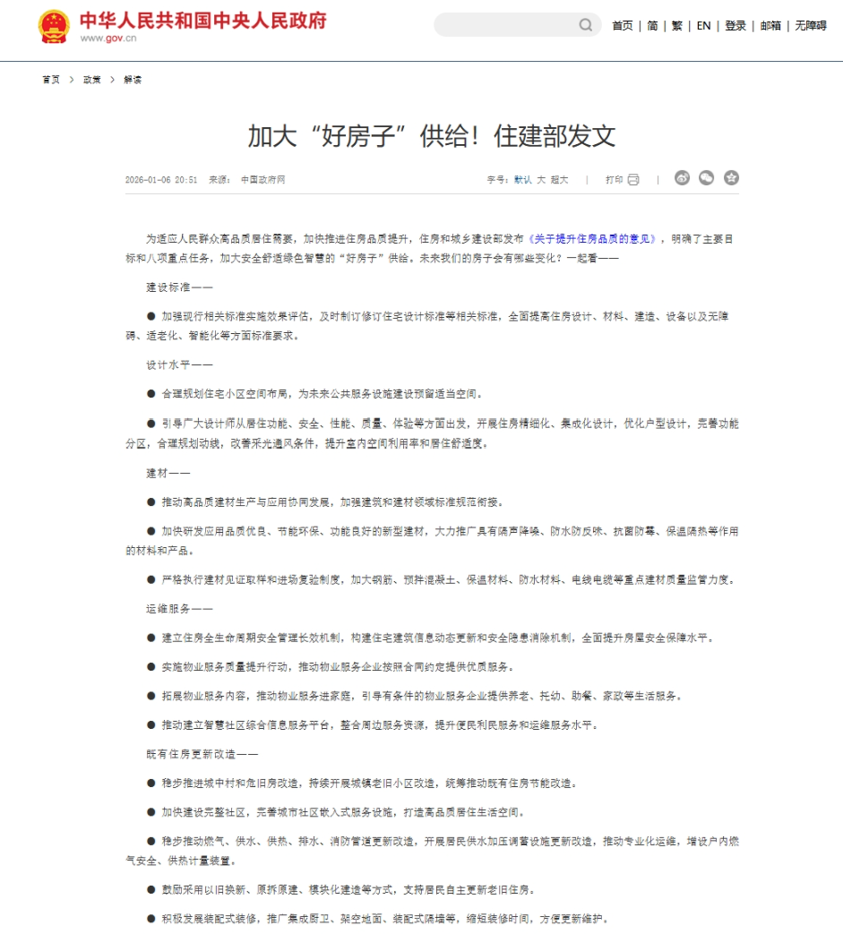 2026年1月6日,住房和城乡建设部正式发布《关于提升住房品质的意见》(以下简称《意见》),明确未来5年“好房子”建设的核心目标与八项重点任务,剑指安全、舒适、绿色、智慧的住房供给提升。