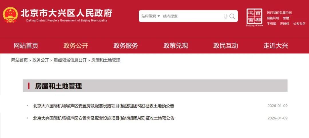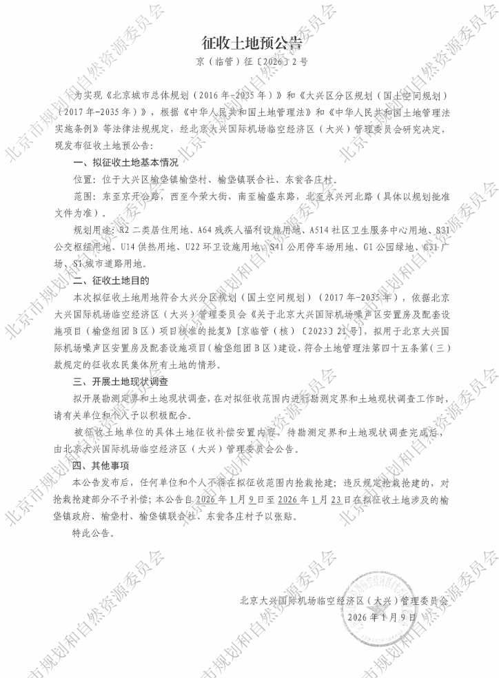 北京大兴国际机场噪声区安置房及配套设施项目(榆垡组团B区)征收土地预公告