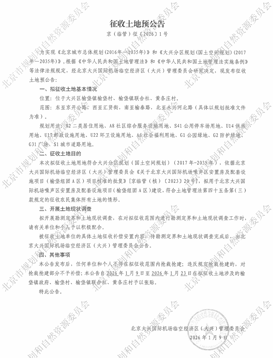 北京大兴国际机场噪声区安置房及配套设施项目(榆垡组团A区)征收土地预公告