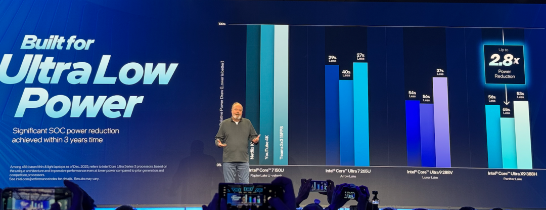 作为采用首款Intel 18A的量产计算平台,第三代酷睿Ultra提升显著,性能提升幅度高达60%,功耗降低40%,可以实现长达27小时的续航时间。