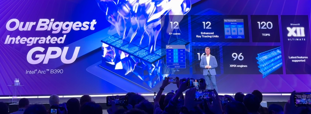 第三代酷睿Ultra集成的全新锐炫GPU B390(也称为12Xe),提供最多12个Xe核心,拥有两倍缓存,相比上一代,性能提升高达77%;并内置96个XMX AI加速器,可提供高达120 TOPS的GPU性能,AI推理性能提升53%。