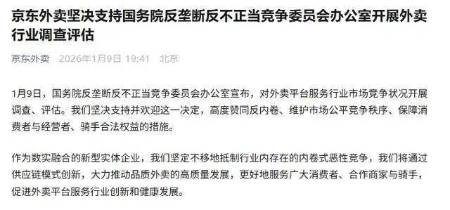 京东外卖:坚决支持开展外卖行业调查评估,抵制内卷式恶性竞争