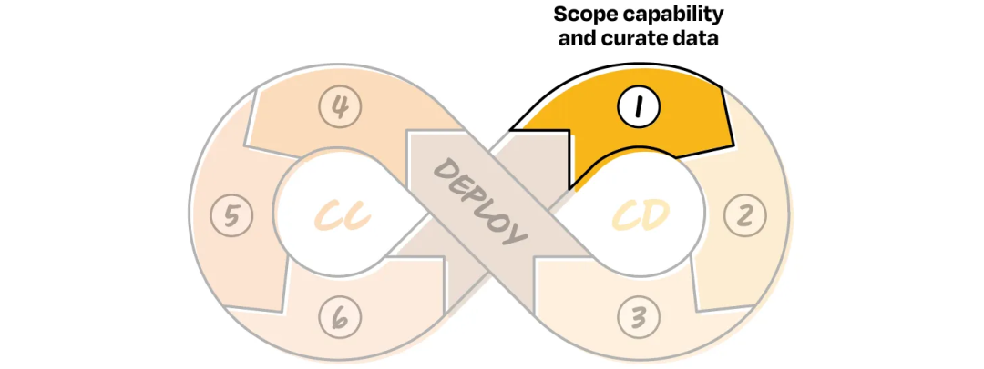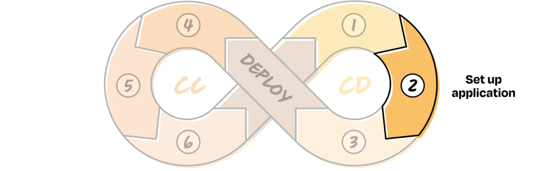 前三个步骤,组成了持续开发 (CD) 这一侧的循环,包括:确定功能范围、设置应用程序和设计评估。