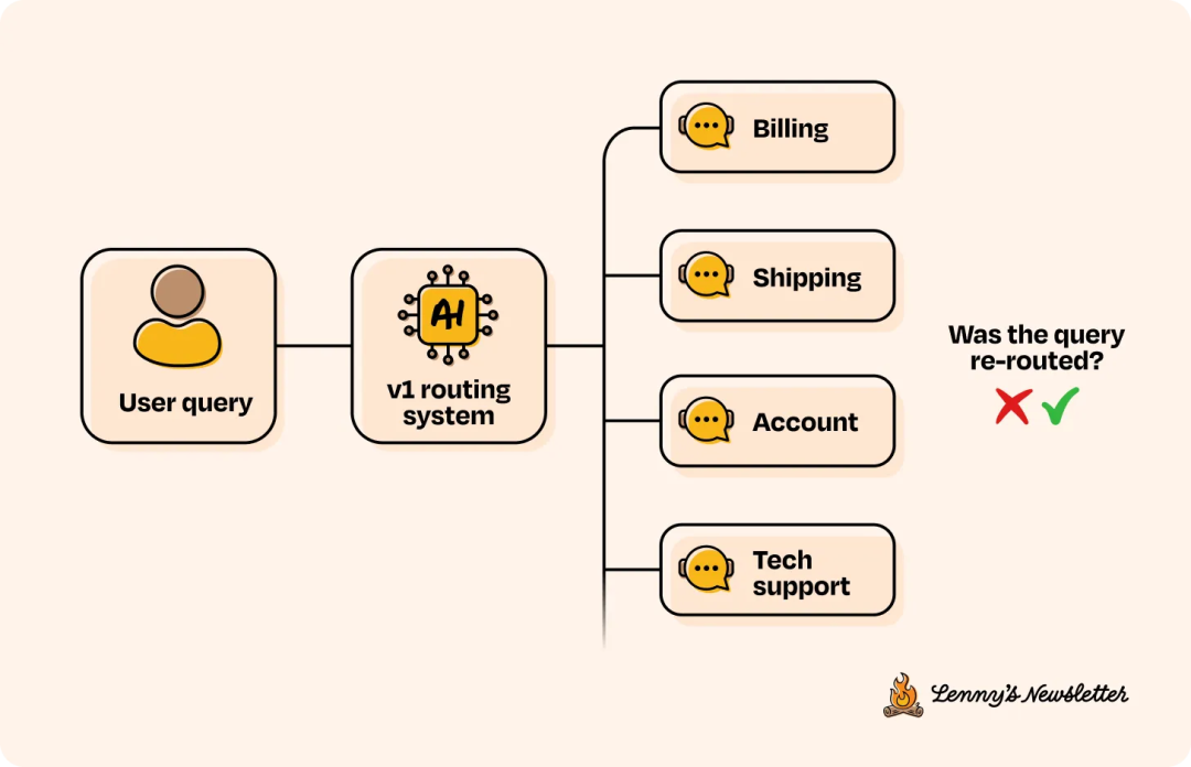 举个例子,在客户支持系统的路由 v1 中,一个简单却很强大的 Eval 就是“路由准确性” —— 也就是看系统将工单正确路由到相应部门的频率。单单这一个指标,就能反映出模型是否在学习正确的区分方式,以及系统设置是否稳固。