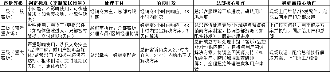 - 增值服务补偿:针对二级/三级客诉用户,总部统一制定增值服务补偿方案(如免费延长全屋质保期、免费上门除甲醛、赠送家居保养服务),由经销商落地执行,费用由总部与经销商分摊;