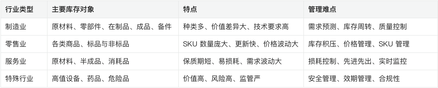 各行业的库存管理对象因其业务性质和产品特性而有显著不同,这直接决定了库存管理的复杂程度和方法选择。