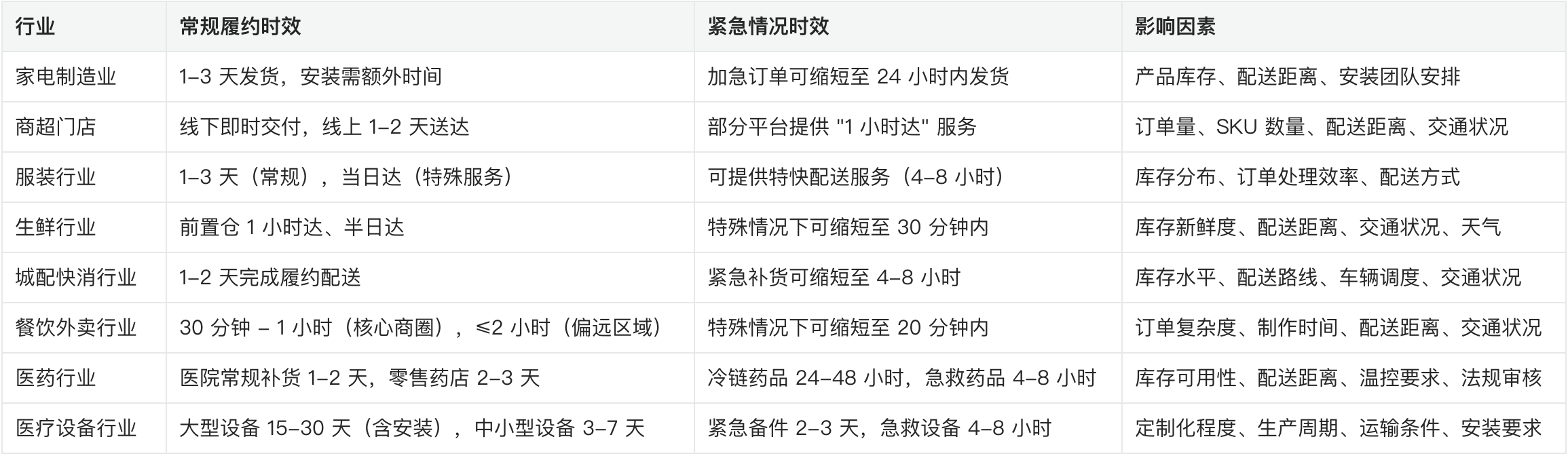 不同行业的履约时效性要求因其产品特性、市场竞争和客户期望而有显著差异,这直接影响企业的运营策略和资源配置。