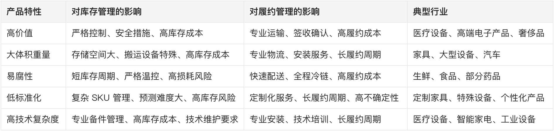 产品特性是影响行业库存与履约管理差异的首要因素,包括产品价值、体积重量、易腐性、标准化程度和技术复杂度等方面。